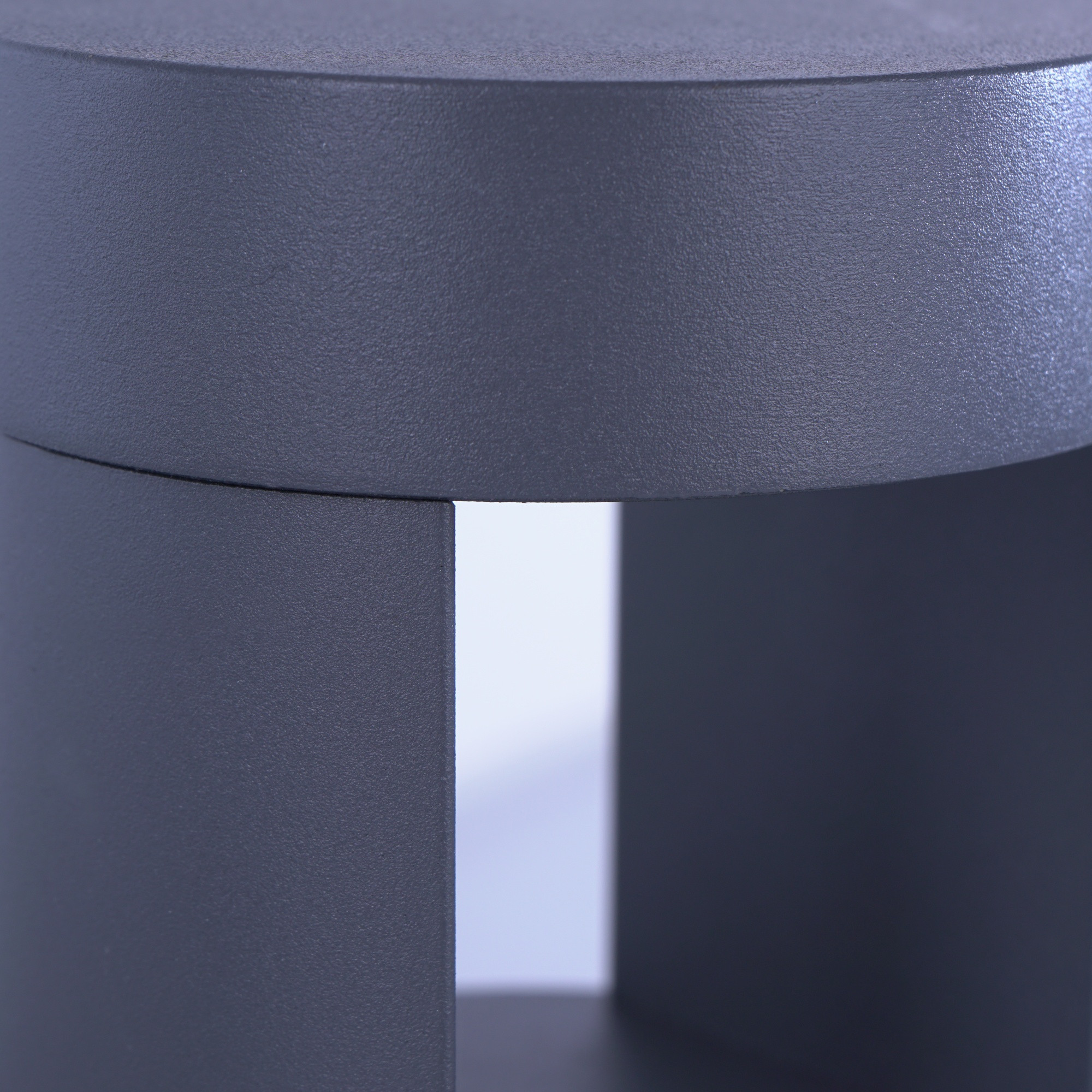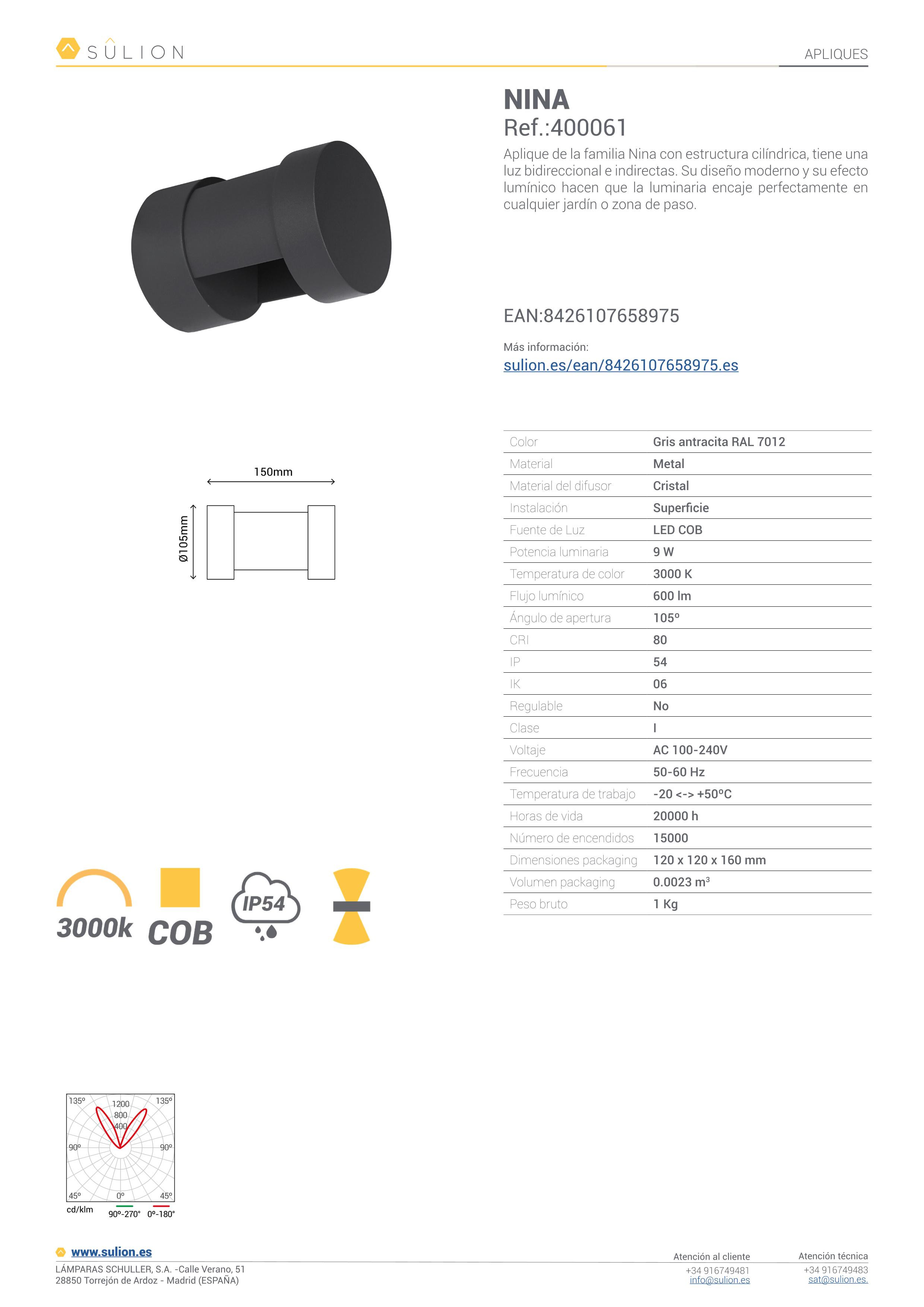 Aplique de la familia Nina con estructura cilíndrica, tiene una luz bidireccional e indirectas. Su diseño moderno y su efecto lumínico hacen que la luminaria encaje perfectamente en cualquier jardín o zona de paso.