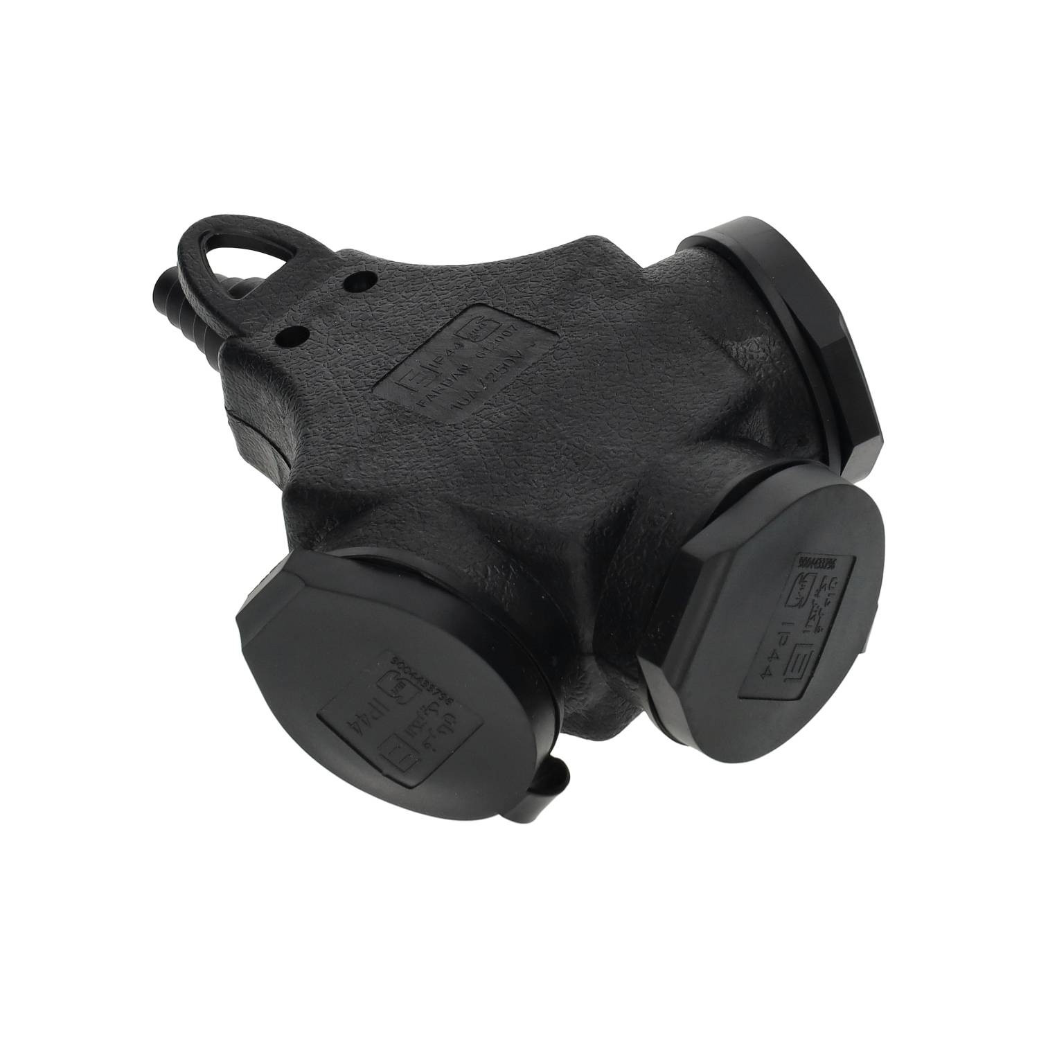 Clavija de enchufe hembra triple tipo F (schuko). Con tapa protectora de goma que la protege frente a la penetración de agua y/o polvo. Soporta una intensidad máxima de 16A y un voltaje de 250VAC. Es un producto que es apto para todo tipo de usos domésticos y/o industriales. Está fabricado en ABS. Es capaz de soportar un voltaje de entrada de 100-240V y una frecuencia de servicio de 50/60 Hz. Dispone de un grado de protección IP44. Dispone de una garantía de 3 años. Cuenta también con el certificado CE, que acredita que se cumple con los requisitos de la UE respecto a compatibilidad electromagnética y normativa de baja tensión. Con este certificado se declara la conformidad de dicho producto con todos los requisitos legales exigidos, y asegura la validez del producto para ser vendido en todo el Espacio Económico Europeo.