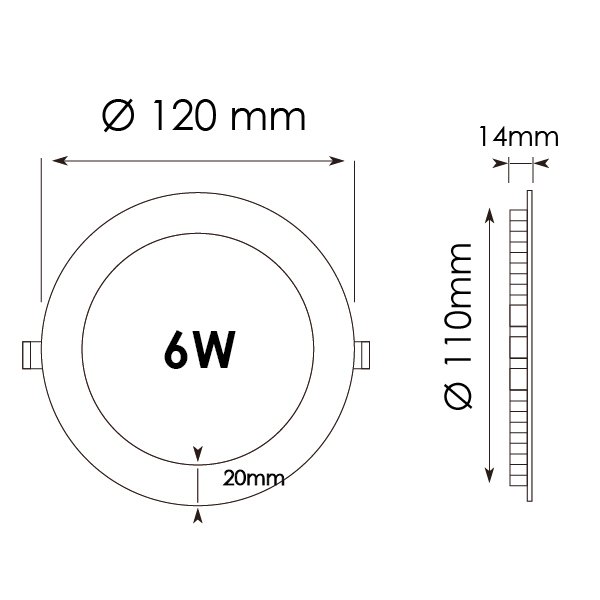 Downlight de LEDs redondo extraplano empotrable de 6W con acabado en color negro, es uno de los productos más utilizados en iluminación ya que es ideal para su instalación en techos, tanto si cuentan con poco o mucho espacio. Debido a su ángulo de dispersión lumínica de 120° lo hace ideal como fuente de iluminación para uso residencial (pasillos, zonas de entrada, salones, dormitorios, baños o cocinas) y espacios más amplios como oficinas, tiendas, hoteles, bares, restaurantes o supermercados. También disponible en versión regulable, adquiriendo el driver regulable. Están diseñados con un grosor ultraplano para poder instalarlos en techos de poca altura. La tecnología LED presenta un menor consumo en comparación con los downlight halógenos convencionales, permitiendo ahorrar cada mes en la factura de la luz. Para evitar daños en el driver o en la luminaria, se debe realizar la instalación sin tensión en la red eléctrica. Nunca conecte un panel a un driver cuando dicho driver tenga tensión eléctrica. Cuenta con una alta eficacia al consumir 6W mediante el LED SMD2835 30 leds que integra, logrando proporcionar un flujo luminoso de 540 lumens. La iluminación que aporta representa un consumo por valor de 6kWh/1000h, lo que supone una reducción de la cantidad de energía facturada y de emisiones de gases contaminantes a la atmósfera. Este downlight está disponible en tres temperaturas de color: blanca (6000°K), neutra (4000°K) y cálida (3000°K). Su instalación debe realizarse en lugares interiores al poseer un grado de protección IP20 (protección contra partículas sólidas de tamaño superior a 12mm y no es resistente al agua). Soporta un voltaje de entrada de 220/240V y una frecuencia de servicio de 50/60 Hz. A la hora de realizar el montaje de cualquier downlight es primordial tener en cuenta tres dimensiones. En primer lugar, el espesor del downlight (14 mm), por otro lado el diámetro de corte (110 mm) que debe ser igual o menor al agujero del techo, y por último el diámetro externo del downlight (120 mm) que tiene que ser mayor al diámetro del agujero. Además de ser un producto que tiene más de 30.000 horas de vida, dispone de una garantía de 3 años. Cuenta también con el certificado CE, que acredita que se cumple con los requisitos de la UE respecto a compatibilidad electromagnética y normativa de baja tensión. Con este certificado se declara la conformidad de dicho producto con todos los requisitos legales exigidos, y asegura la validez del producto para ser vendido en todo el Espacio Económico Europeo. Incluye driver