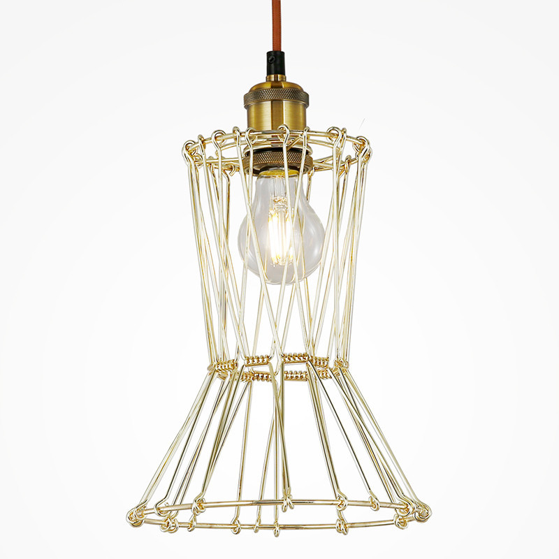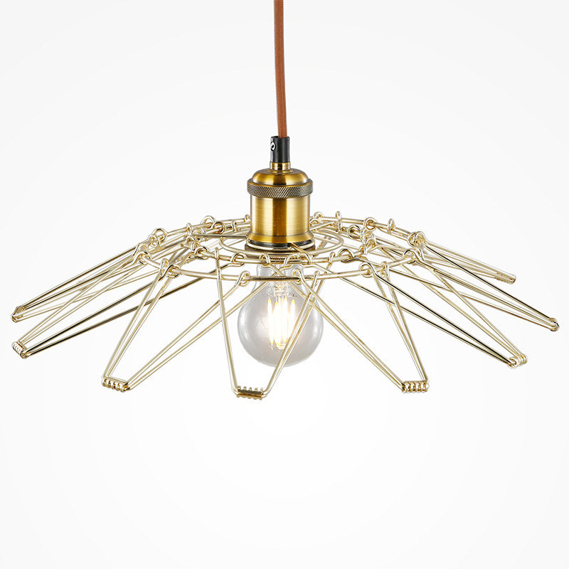 Lámpara colgante tipo jaula con base para una bombilla de casquillo E27. Su estructura plegable permite cambiar la forma de la lámpara, pudiendo adoptar gran cantidad de formas distintas.Ideal para la decoración de hogares, bares, comercios, etc.Lámpara disponible en color oro. Para otros colores personalizados contacte con nuestro servicio de atención al cliente. Incluye portalámparas y cable textil de 120 cm.No incluye bombilla.