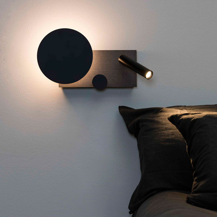 Applique KLEE de Faro Barcelona. Elle intègre une lampe de lecture et une lumière indirecte réglable pour un éclairage d'ambiance. Son design innovant en fait un élément décoratif idéal pour les environnements contemporains, les hôtels et la décoration d'intérieur.