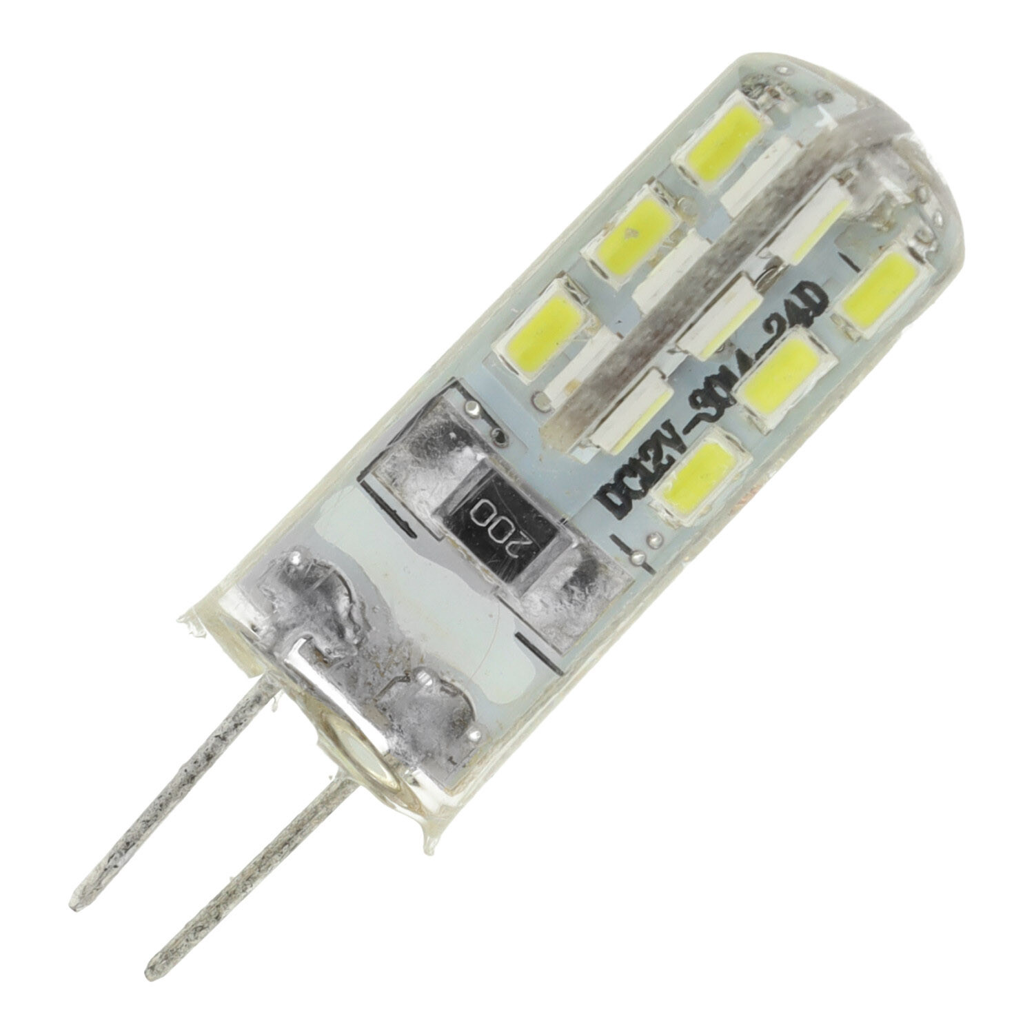 La bombilla G4 1.5W bi-pin es una opción ideal para iluminar espacios pequeños como vehículos, embarcaciones, flexos, lámparas etc. Este tipo de iluminaria tiene una vida útil, y un ahorro mucho mayor que una luz convencional (ahorran un 90%). Este tipo de bombillas sustituyen a las halógenas G4. Si quisiésemos optar por cambiar la bombilla bi-pin halógena por una led, únicamente habría que sustituir una por otra. Este tipo de bombilla tiene una potencia de 1.5W. Está fabricada con las medidas de Ø 10 x 35 mm, e integra unos LEDs que proporcionan un flujo luminoso de 50 lumens distribuyendo la luz en un ángulo de apertura de 360°. Puede soportar un voltaje de entrada de 12V de corriente continua. Disponible en dos temperaturas de color: blanca (6000°K) y cálida (3000°K) Su instalación debe realizarse en lugares interiores al poseer un grado de protección IP20 (protección contra partículas sólidas de tamaño superior a 12 mm y no es resistente al agua). Además de ser un producto que tiene más de 15.000 horas de vida, dispone de una garantía de 3 años. Cuenta también con el certificado CE, que acredita que se cumple con los requisitos de la UE respecto a compatibilidad electromagnética y normativa de baja tensión. Con este certificado se declara la conformidad de dicho producto con todos los requisitos legales exigidos, y asegura la validez del producto para ser vendido en todo el Espacio Económico Europeo.