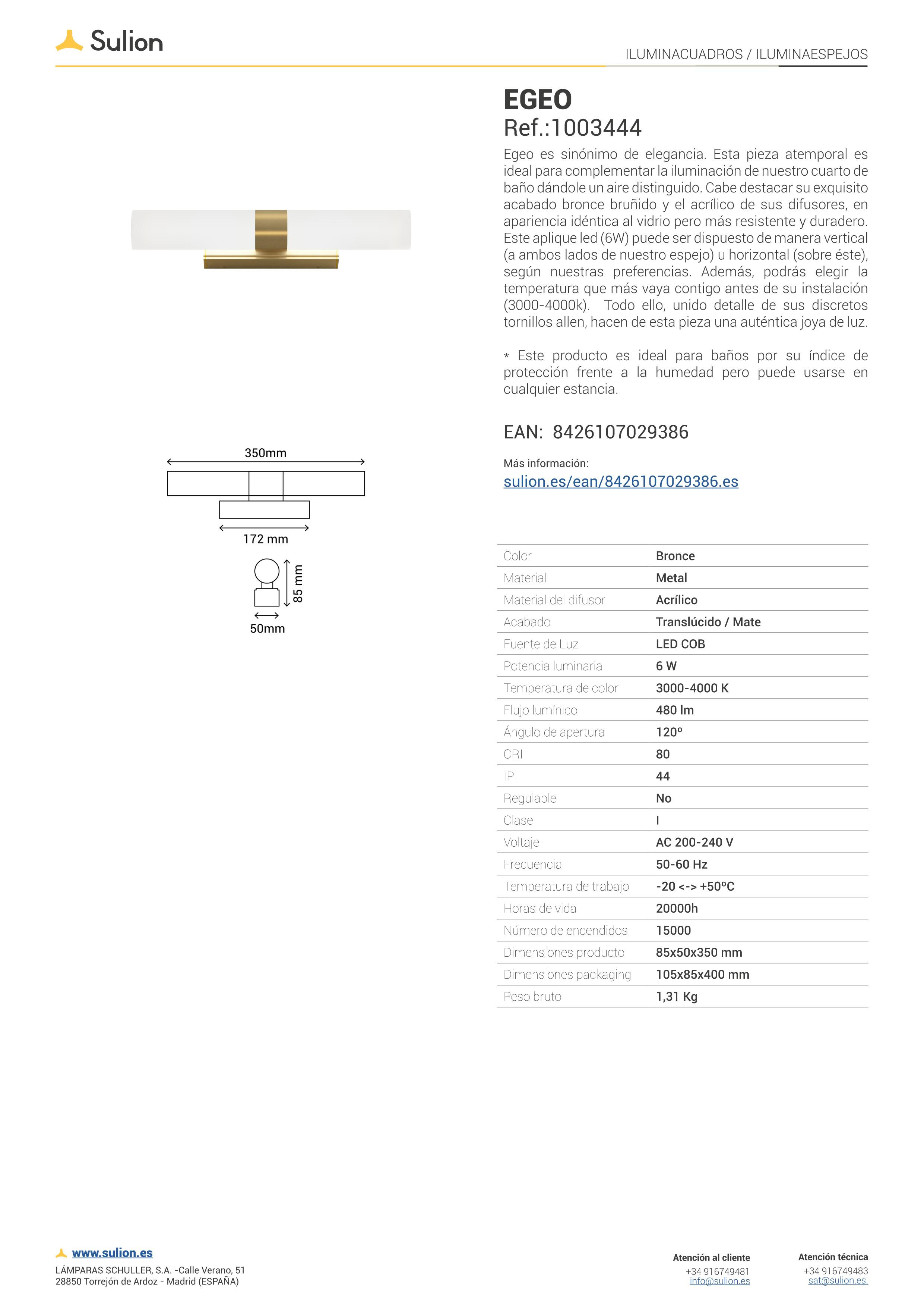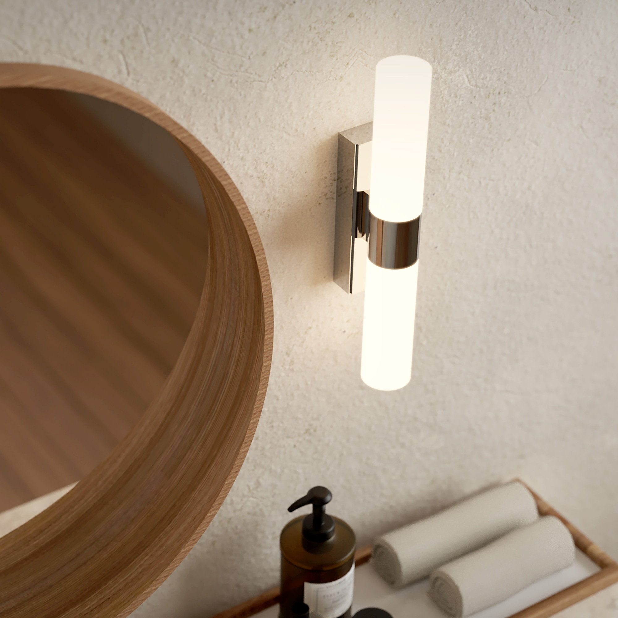 Egeo es sinónimo de elegancia. Esta pieza atemporal es ideal para complementar la iluminación de nuestro cuarto de baño dándole un aire distinguido. Cabe destacar su exquisito acabado y el acrílico de sus difusores, en apariencia idéntica al vidrio pero más resistente y duradero. Este aplique led (6W) puede ser dispuesto de manera vertical (a ambos lados de nuestro espejo) u horizontal (sobre éste), según nuestras preferencias. Además, podrás elegir la temperatura que más vaya contigo antes de su instalación (3000-4000k). Todo ello, unido detalle de sus discretos tornillos allen, hacen de esta pieza una auténtica joya de luz. *Este producto es ideal para baños por su índice de protección frente a la humedad pero puede usarse en cualquier estancia.