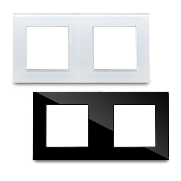 Marco embellecedor de cristal para dos elementos, disponible en dos colores: blanco o negro. Ideal para crear un acabado moderno y minimalista en cualquier instalación interior. Es un mecanismo apto para instalación sobre cajas de mecanismos empotrables universales. No compatible con los mecanismos de la serie PC. Está diseñado en cristal y policarbonato con las medidas 157 x 86 x 9 mm. Debido a su grado de protección IP20 es ideal para instalar en zonas interiores (protección contra partículas sólidas de tamaño superior a 12mm y no es resistente al agua). Dispone de una garantía de 3 años. Cuenta también con el certificado CE, que acredita que se cumple con los requisitos de la UE respecto a compatibilidad electromagnética y normativa de baja tensión. Con este certificado se declara la conformidad de dicho producto con todos los requisitos legales exigidos, y asegura la validez del producto para ser vendido en todo el Espacio Económico Europeo. Incluye bastidor.