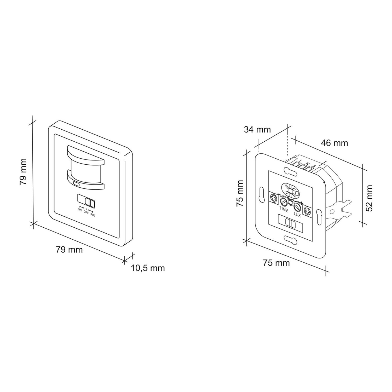 Sensor de movimiento para instalar empotrado. Permite ajustar el tiempo de encendido y sensibilidad de luz. Es un mecanismo ideal para el encendido automático de luminarias en multitud de estancia como pasillos, escaleras, baños, habitaciones, etc. El sensor tiene tres modos de funcionamiento seleccionables: encendido, apagado y detector. Características principales: – Alcance máximo: 9 m – Ajuste de tiempo: desde 10 seg hasta 7 min – Ajuste de luminosidad: de 3 hasta 2000 lux – Altura de instalación recomendada: 1 a 1.8 m – Consumo del sensor: 0.1W – Soporta cargas de hasta un máximo de 1200W en incandescencia y 300W en led Está diseñado con las medidas de 80x 80 x 47 mm. Permite un voltaje de entrada de 220/240V y una frecuencia de servicio de 50/60 Hz. Debido a su grado de protección IP20 es ideal para instalar en zonas interiores (protección contra partículas sólidas de tamaño superior a 12mm y no es resistente al agua). Se puede instalar en cajas de mecanismos universales. Dispone de una garantía de 3 años. Cuenta también con el certificado CE, que acredita que se cumple con los requisitos de la UE respecto a compatibilidad electromagnética y normativa de baja tensión. Con este certificado se declara la conformidad de dicho producto con todos los requisitos legales exigidos, y asegura la validez del producto para ser vendido en todo el Espacio Económico Europeo. Incluye manual de instrucciones. Incluye tornillos para el montaje. Para más información, consultar el apartado “Manuales y descargas”