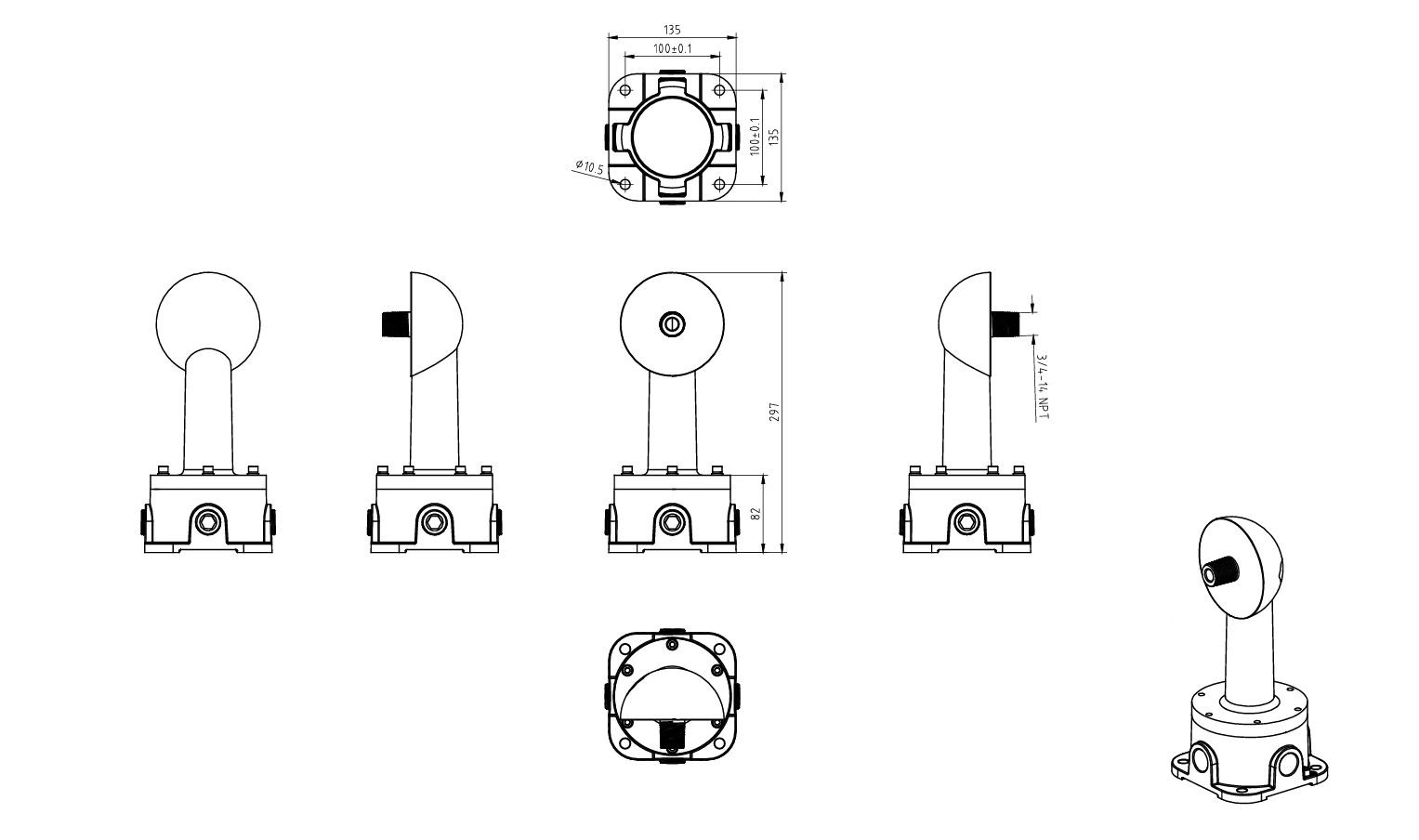 Soporte industrial de aluminio acabado en color gris, para instalación en superficie de luminarias antideflagrantes. Cuenta tanto con la certificación ATEX como IECEX, haciéndolo apto para zonas con atmósferas potencialmente explosivas.Su grado de protección IP66 permite su instalación en zonas húmedas. La parte inferior consta de una caja de empalmes con cuatro vías roscadas de métrica NPT 3/4″ (cerradas con tapón hexagonal). Se deben adquirir prensaestopas ATEX para las vías que se vayan a utilizar. Luminaria ideal para fábricas, almacenes, talleres, naves industriales, embarcaciones, cabinas de pintura, gasolineras y zonas con atmósferas potencialmente explosivas en general. Características: – Compatible con nuestros proyectores y campanas ATEX de cualquier potencia. – Pintado mediante pulverización electrostática, con alto grado anticorrosión. – Apto para zonas 1 y 2 (gases) + 21 y 22 (polvo). – Marcado II 2 GD Ex db IIB+H2 T6/T5 Gb Ex tb IIC T80°C/T95ºC Db – Tamb: -60ºC / +40ºC (T6/T80ºC) – Cierre hermético mediante rosca (fijada con tornillos de cabeza hexagonal A2-70). – Tamaño de la base : 134 x 134 mm. – Longitud total del brazo: 297 mm. – Tornillos de fijación en superficie no incluidos.