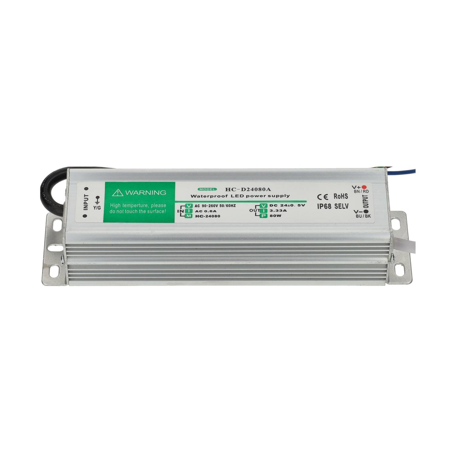Transformador led especialmente indicado para tiras led de potencia no superior a 80W. No obstante, se pueden utilizar para otros aparatos de iluminación led que funcionen a 24V de corriente continua. Permite un voltaje de entrada de 110-260V y una frecuencia de servicio de 50/60 Hz. Intensidad de salida de 3.33A. Posee un grado de protección IP67 lo que lo convierte en un aparato ideal para su instalación en zonas exteriores. Dispone de una garantía de 3 años. Cuenta también con el certificado CE, que acredita que se cumple con los requisitos de la UE respecto a compatibilidad electromagnética y normativa de baja tensión. Con este certificado se declara la conformidad de dicho producto con todos los requisitos legales exigidos, y asegura la validez del producto para ser vendido en todo el Espacio Económico Europeo.