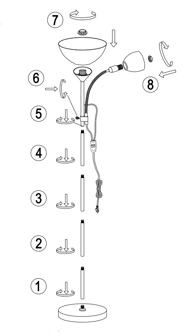 Presenta dos portalámparas, el principal E27 y el del lector es E14. Bombillas no incluidas. Peso neto de 3240 gramos. Medidas del embalaje: 40x31x17 cm.
