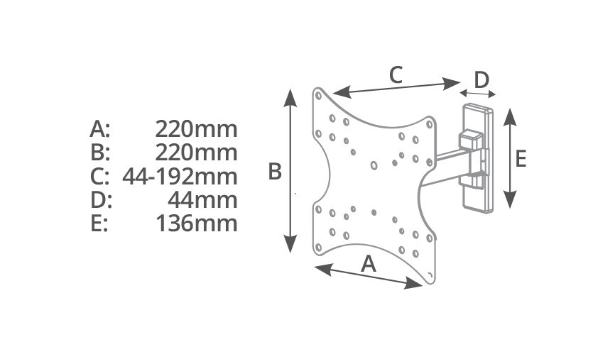 Sistema de anclaje universal VESA 75/100. Inclinación arriba y abajo de 15°. Oscilación lateral de 90°. Brazo de acero. Distancia a la pared: 39 a 169 mm. Fácil y rápida instalación. Compatible con todas las marcas. Incluye manual para su instalación y ki