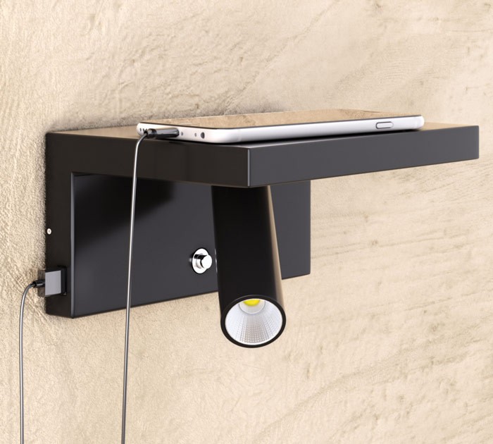 Aplique Beam de Beneito Faure. Su diseño geométrico incluye un cargador USB para teléfonos y tablets y le permite funcionar como repisa. Perfecto para habitaciones de hogares y hoteles.