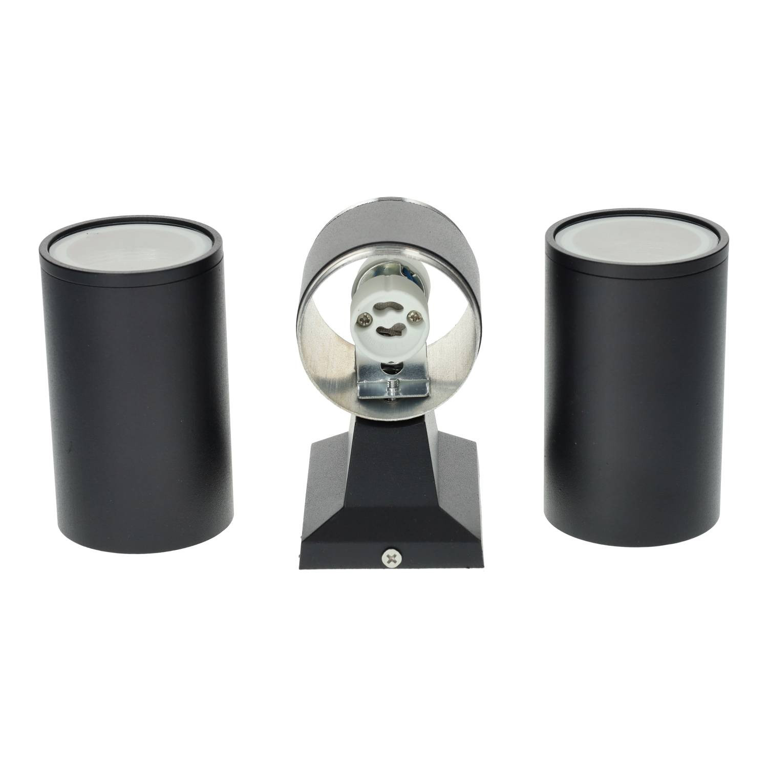 Aplique de aluminio con base para dos bombillas de casquillo G10, con acabado en color negro. Es una iluminaria ideal para instalar en hogares, fachadas, jardines, terrazas etc. Soporta un voltaje de entrada de 85-265V y una frecuencia de servicio de 50/60Hz. Su instalación puede ser tanto en espacios interiores como exteriores debido a su grado de protección IP54 (protección ante el polvo y ante salpicaduras). Dispone de una garantía de 3 años. Cuenta también con el certificado CE, que acredita que se cumple con los requisitos de la UE respecto a compatibilidad electromagnética y normativa de baja tensión. Con este certificado se declara la conformidad de dicho producto con todos los requisitos legales exigidos, y asegura la validez del producto para ser vendido en todo el Espacio Económico Europeo. No incluye bombillas
