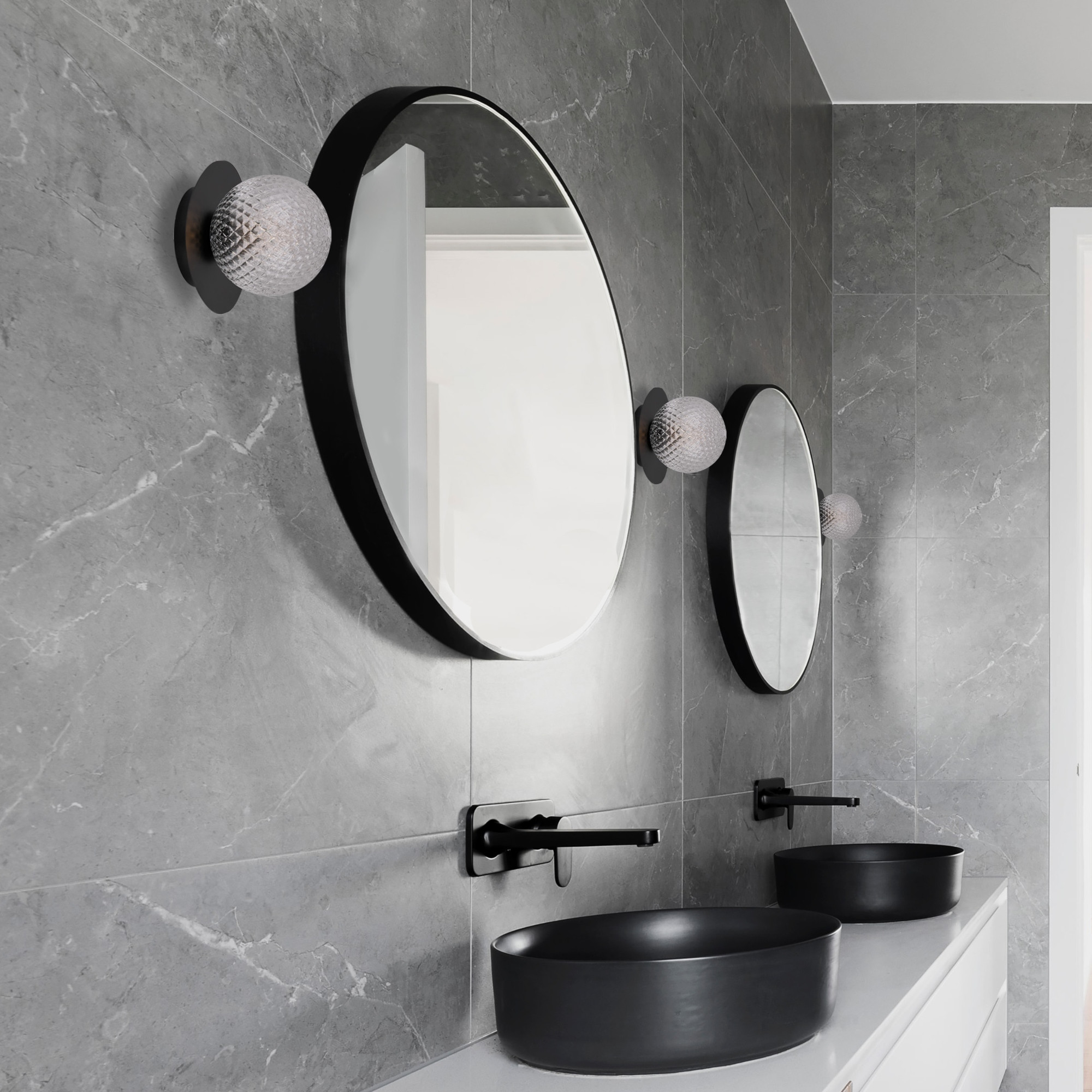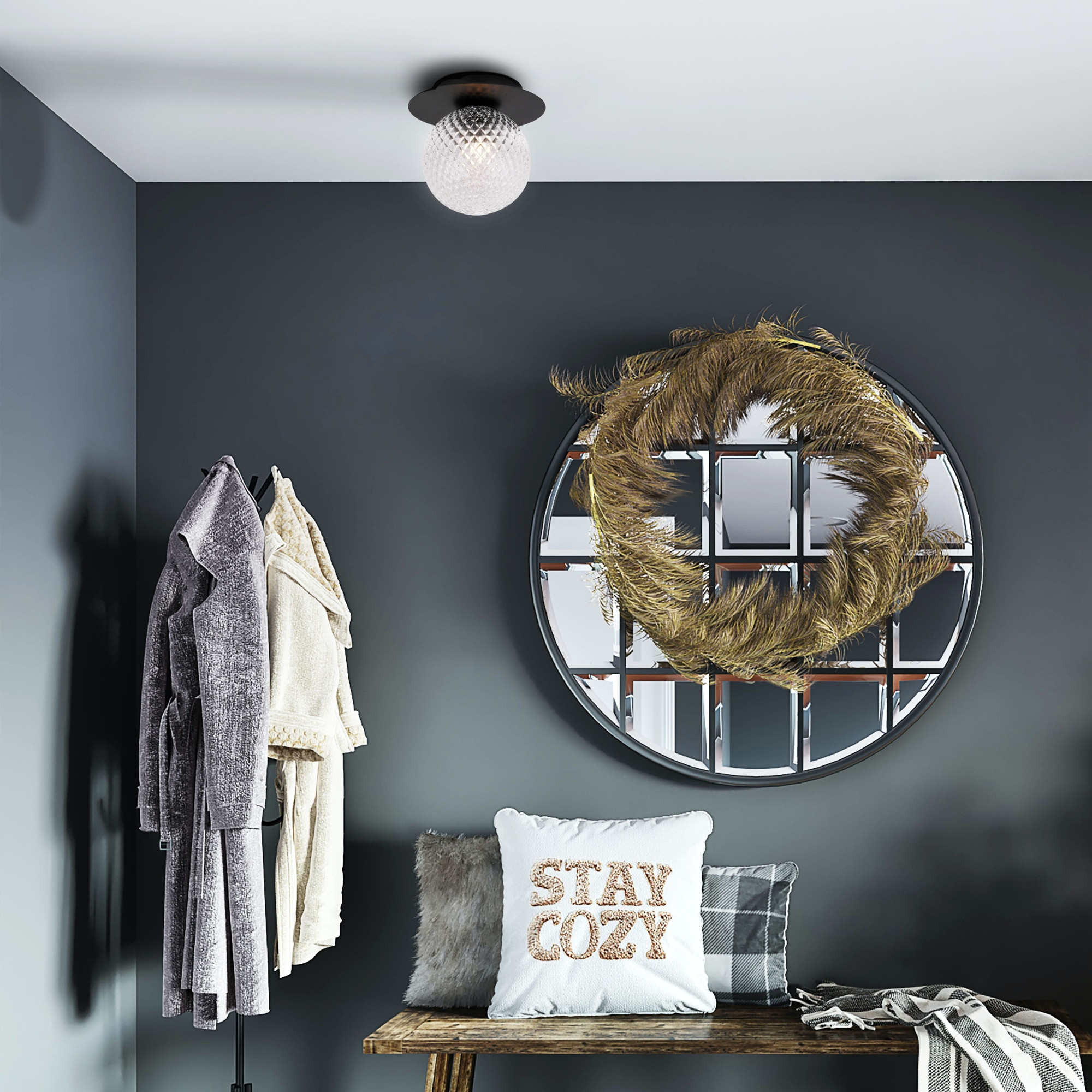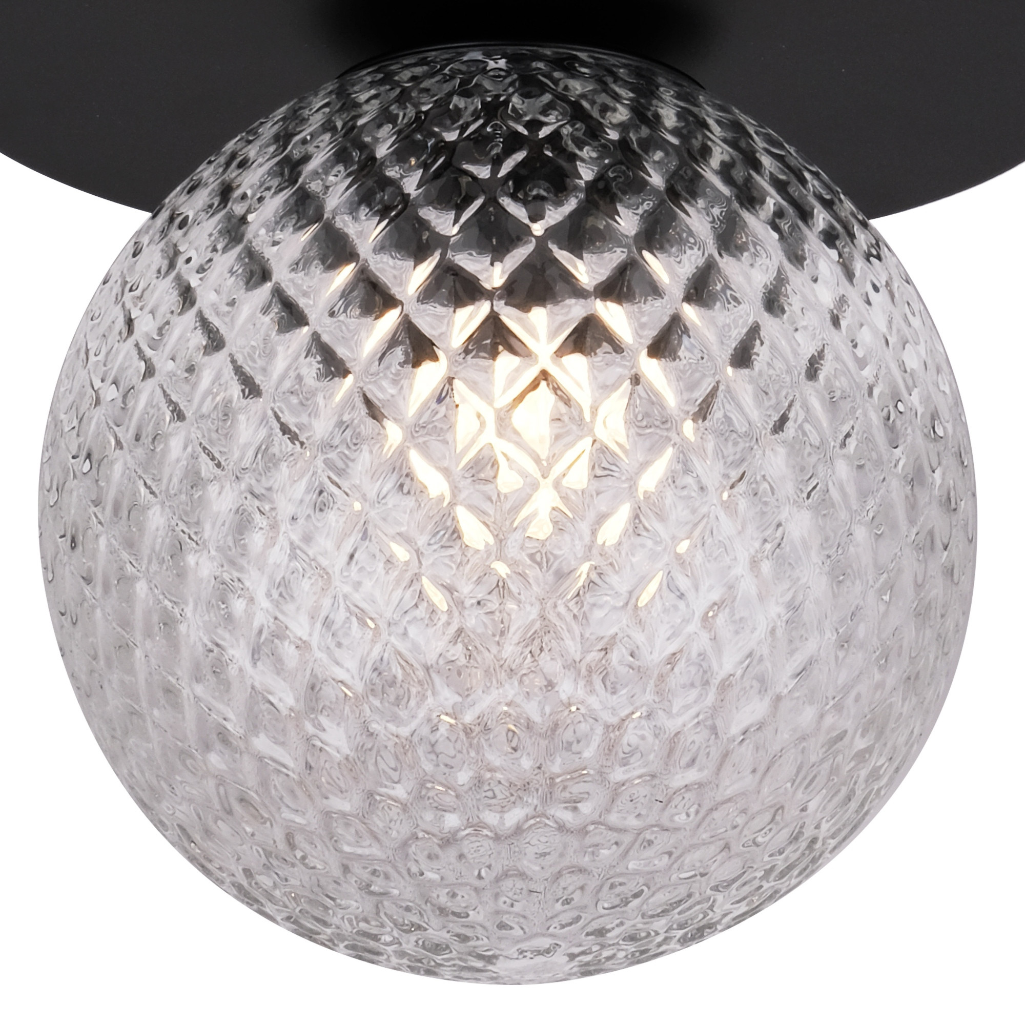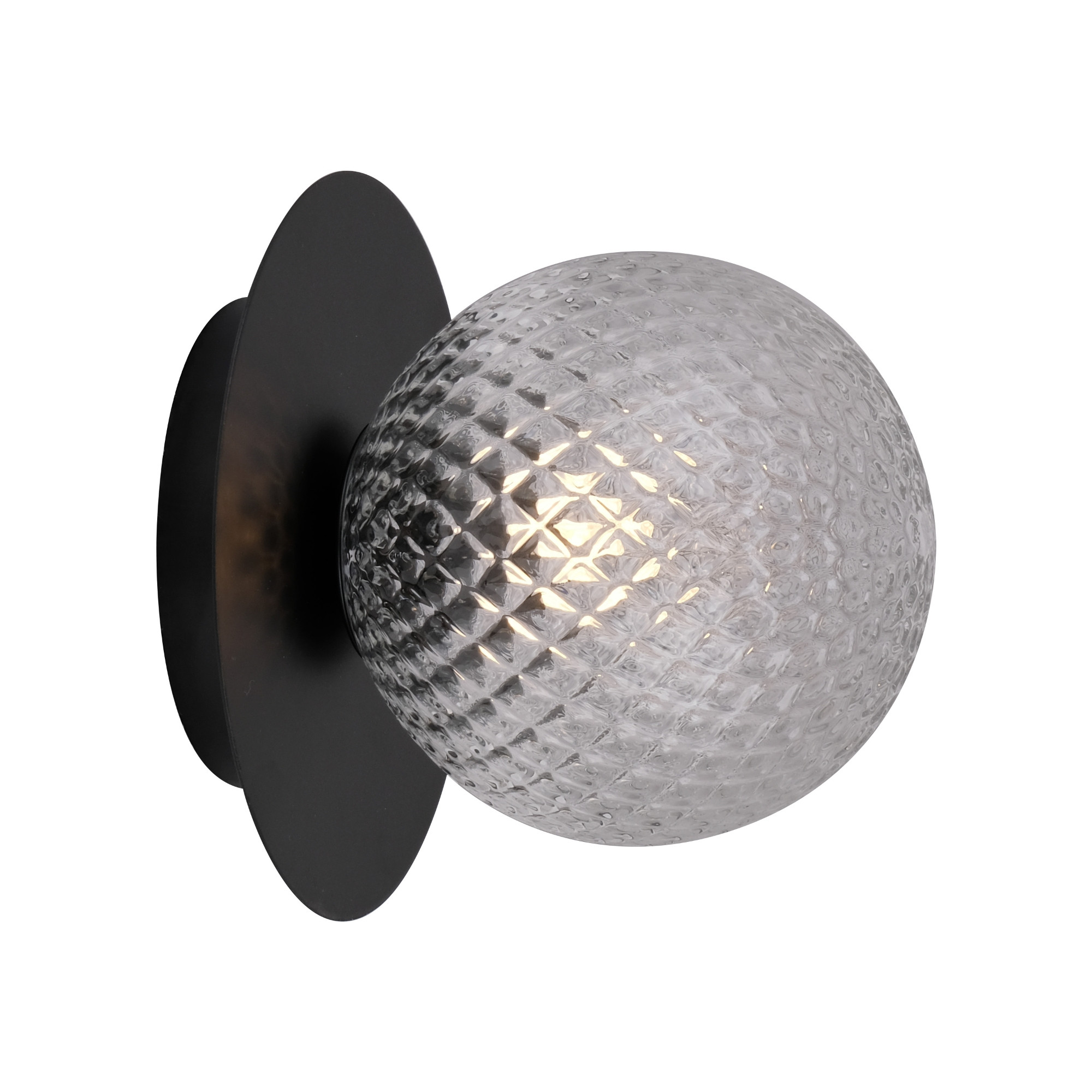 Aplique con bola de vidrio texturizada y base de metal en acabado cromo. El aplique Musa es sinónimo de elegacia. Se trata de un diseño atemporal y aparentemente sencillo que se atreve a dar un paso más cuando, al iluminarse, los dibujos de la esfera de vidrio se proyectan sobre el metal creando un efecto visual único. Usa bombilla G9.