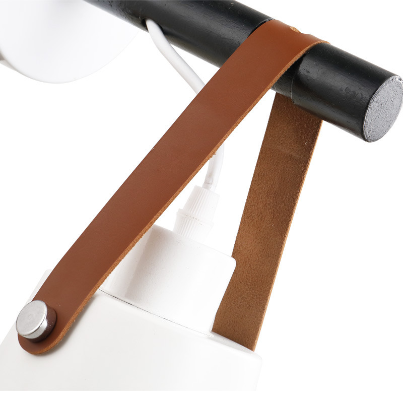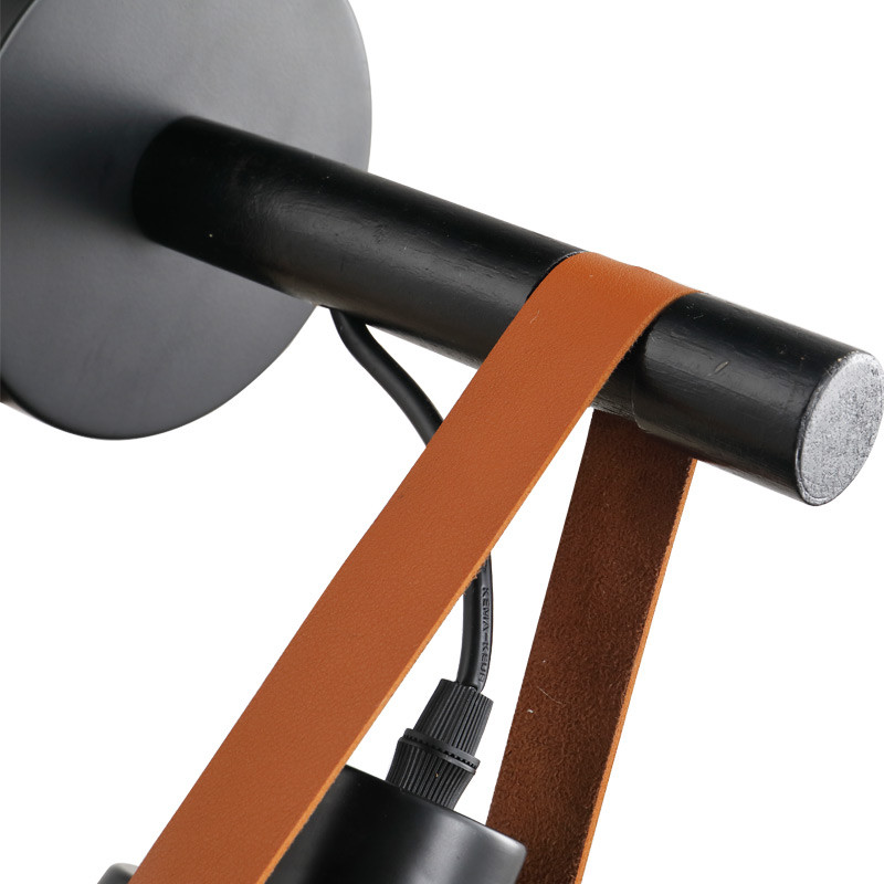 Aplique metálico con cuerpo suspendido mediante cinta de cuero en travesaño de madera, disponible en color blanco y negro. La lámpara tiene una base que permite la colocación de cualquier bombilla de casquillo E27. Este tipo de luminaria es ideal para crear ambientes modernos en el hogar, bares, restaurantes, hoteles o tiendas. Su instalación debe realizarse en lugares interiores al poseer un grado de protección IP20 (protección contra partículas sólidas de tamaño superior a 12 mm y no es resistente al agua). Dispone de una garantía de 3 años. Cuenta también con el certificado CE, que acredita que se cumple con los requisitos de la UE respecto a compatibilidad electromagnética y normativa de baja tensión. Con este certificado se declara la conformidad de dicho producto con todos los requisitos legales exigidos, y asegura la validez del producto para ser vendido en todo el Espacio Económico Europeo. No incluye bombilla.
