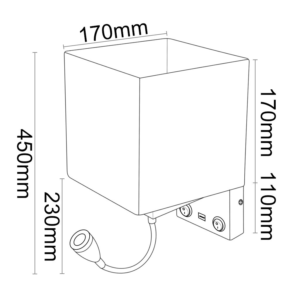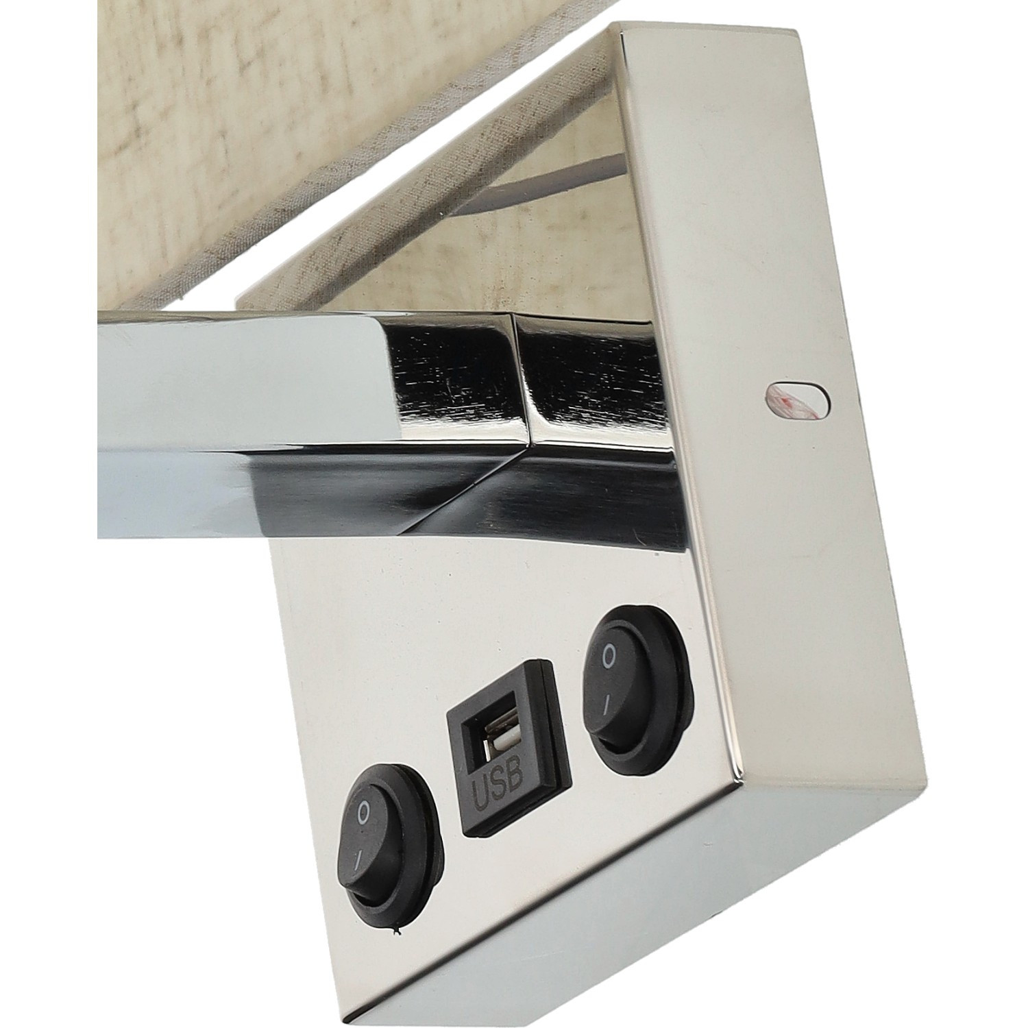 Aplique de aluminio con tulipa de tela con base para una bombilla de rosca E27. Cuenta además con un punto de luz LED flexible de 1W de potencia en luz cálida.  Incorpora un puerto USB ideal para cargar todo tipo de aparatos electrónicos. Especialmente indicado para su uso en dormitorios, hoteles, apartamentos… Interruptores independientes para la luz general y la luz de lectura. Admite bombillas de una potencia máxima de hasta 40W. Bombilla no incluida.
