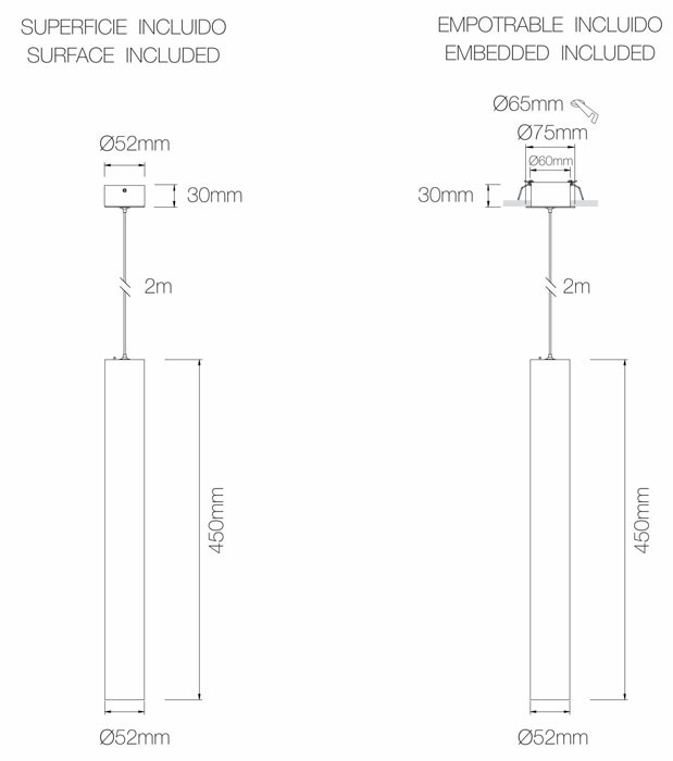Lámpara colgante LED ATMOS 45 de Beneito Faure. 10W y switch CCT para cambiar la temperatura de luz. Puede montarse empotrada o en superficie.