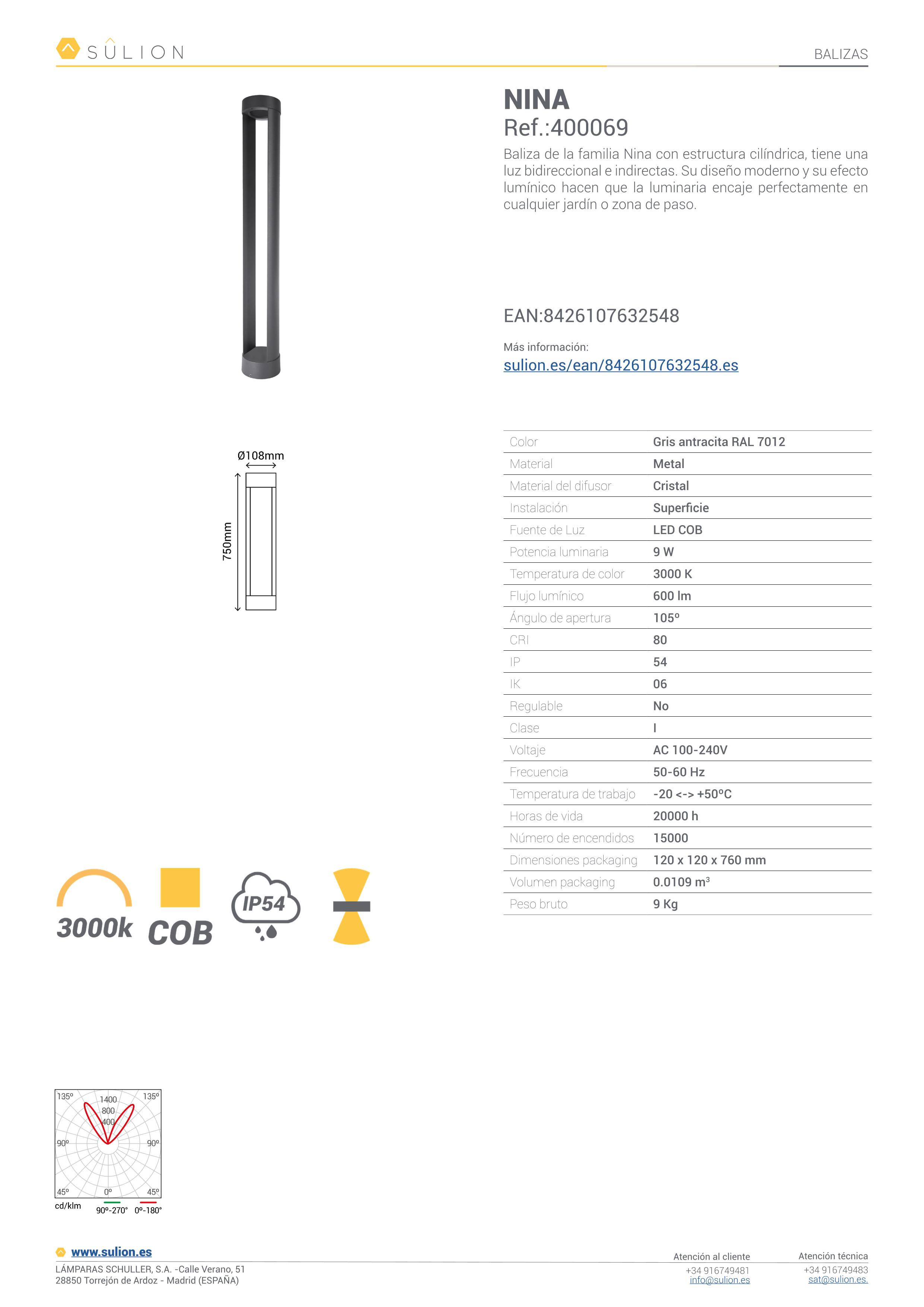 Baliza LED NINA 75 cm de Sulion. 9W, iluminación eficiente para jardines y exteriores.