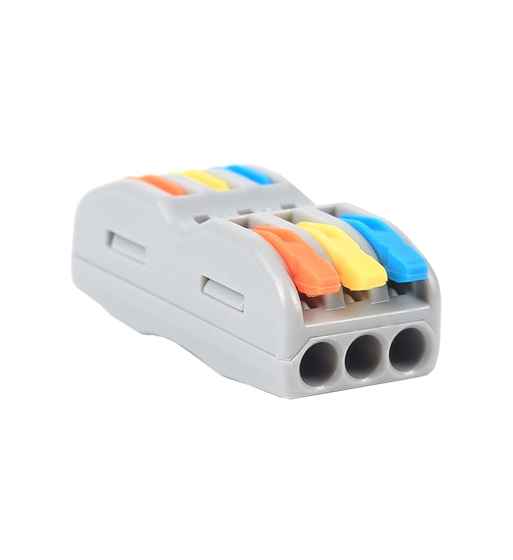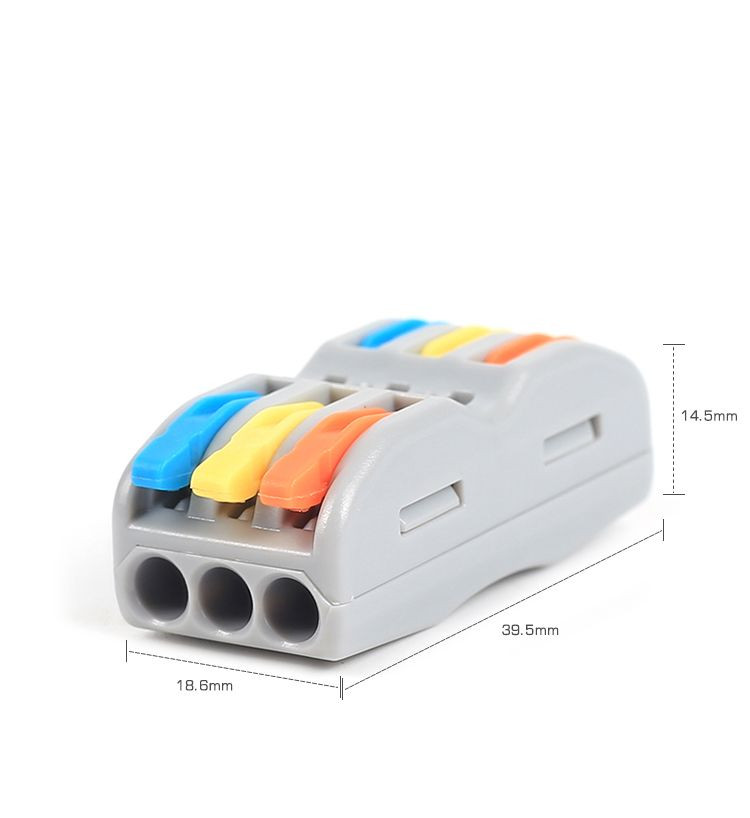 Conector rápido de tres entradas y tres salidas, fabricado en plástico de alta resistencia. Permite unir fácilmente cables desde 0,08 hasta 4 mm². Permite un voltaje de entrada de 100-265V y una intensidad de salida de 32A. Debido a su grado de protección IP20 es ideal para instalar en zonas interiores (protección contra partículas sólidas de tamaño superior a 12mm y no es resistente al agua). Dispone de una garantía de 3 años. Cuenta también con el certificado CE, que acredita que se cumple con los requisitos de la UE respecto a compatibilidad electromagnética y normativa de baja tensión. Con este certificado se declara la conformidad de dicho producto con todos los requisitos legales exigidos, y asegura la validez del producto para ser vendido en todo el Espacio Económico Europeo.