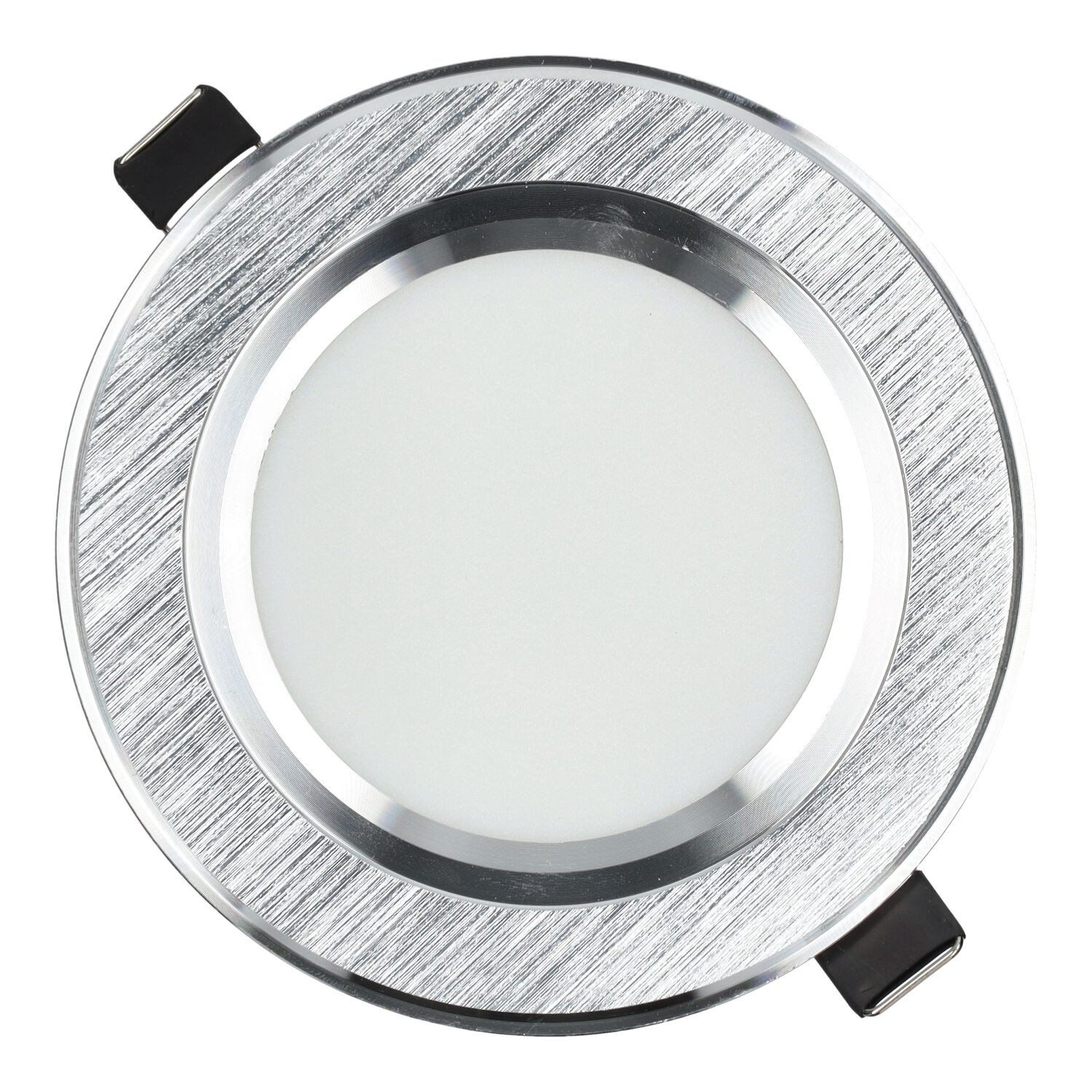 Downlight de LEDs redondo empotrable de gran angular de 7W con acabado en color plata, es uno de los productos más utilizados en iluminación ya que es ideal para su instalación en techos, tanto si cuentan con poco o mucho espacio. Debido a su ángulo de dispersión lumínica de 120° lo hace ideal como fuente de iluminación para uso residencial (pasillos, zonas de entrada, salones, dormitorios, baños o cocinas) y espacios más amplios como oficinas, tiendas, hoteles, bares, restaurantes o supermercados. No permite regular la intensidad de luz. La tecnología LED presenta un menor consumo en comparación con los downlight halógenos convencionales, permitiendo ahorrar cada mes en la factura de la luz. Para evitar daños en el driver o en la luminaria, se debe realizar la instalación sin tensión en la red eléctrica. Nunca conecte un panel a un driver cuando dicho driver tenga tensión eléctrica. Cuenta con una alta eficacia al consumir 7W mediante el LED SMD3030 7 leds que integra, logrando proporcionar un flujo luminoso de 600 lumens. La iluminación que aporta representa un consumo por valor de 7kWh/1000h, lo que supone una reducción de la cantidad de energía facturada y de emisiones de gases contaminantes a la atmósfera. Este downlight está disponible en dos temperaturas de color: blanca (6000°K) y cálida (3000°K). Su instalación debe realizarse en lugares interiores al poseer un grado de protección IP20 (protección contra partículas sólidas de tamaño superior a 12mm y no es resistente al agua). Soporta un voltaje de entrada de 220V y una frecuencia de servicio de 50/60 Hz. A la hora de realizar el montaje de cualquier downlight es primordial tener en cuenta tres dimensiones. En primer lugar, el espesor del downlight (90 mm), por otro lado el diámetro de corte (82 mm) que debe ser igual o menor al agujero del techo, y por último el diámetro externo del downlight (108 mm) que tiene que ser mayor al diámetro del agujero. Además de ser un producto que tiene más de 30.000 horas de vida, dispone de una garantía de 3 años. Cuenta también con el certificado CE, que acredita que se cumple con los requisitos de la UE respecto a compatibilidad electromagnética y normativa de baja tensión. Con este certificado se declara la conformidad de dicho producto con todos los requisitos legales exigidos, y asegura la validez del producto para ser vendido en todo el Espacio Económico Europeo. Incluye driver
