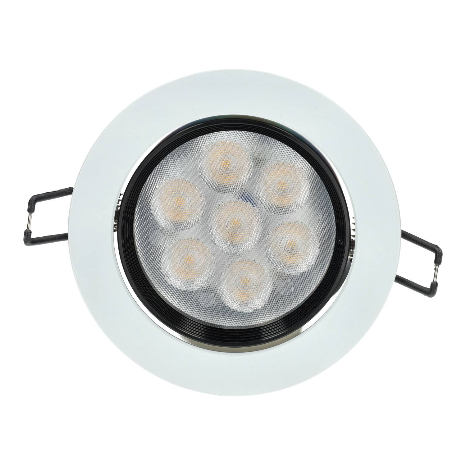 Downlight de LEDs redondo empotrable con acabado en color blanco, es uno de los productos más utilizados en iluminación ya que es ideal para su instalación en techos, tanto si cuentan con poco o mucho espacio. Debido a su ángulo de dispersión lumínica de 40° y su estructura basculante, lo hace ideal como fuente de iluminación para uso residencial (pasillos, zonas de entrada, armarios, salones, dormitorios, baños o cocinas) y espacios más amplios como oficinas, tiendas, hoteles, bares, restaurantes o supermercados. No permite regular la intensidad de luz. La tecnología LED presenta un menor consumo en comparación con los downlight halógenos convencionales, permitiendo ahorrar cada mes en la factura de la luz. Cuenta con una alta eficacia al consumir 7W mediante el LED SMD3030 3 leds que integra, logrando proporcionar un flujo luminoso de 700 lumens. La iluminación que aporta representa un consumo por valor de 7kWh/1000h, lo que supone una reducción de la cantidad de energía facturada y de emisiones de gases contaminantes a la atmósfera. Este downlight está disponible en dos temperaturas de color: blanca (6000°K) y cálida (3000°K). Su instalación debe realizarse en lugares interiores al poseer un grado de protección IP20 (protección contra partículas sólidas de tamaño superior a 12 mm y no es resistente al agua). Soporta un voltaje de entrada de 200V y una frecuencia de servicio de 50/60 Hz. A la hora de realizar el montaje de cualquier downlight es primorcial tener en cuenta tres dimensiones. En primer lugar, el espesor del downlight (90 mm), por otro lado el diámetro de corte (94 mm) que debe ser igual o menor al agujero del techo, y por último el diámetro externo del downlight (108 mm) que tiene que ser mayor al diámetro del agujero. Además de ser un producto que tiene más de 30.000 horas de vida, dispone de una garantía de 3 años. Cuenta también con el certificado CE, que acredita que se cumple con los requisitos de la UE respecto a compatibilidad electromagnética y normativa de baja tensión. Con este certificado se declara la conformidad de dicho producto con todos los requisitos legales exigidos, y asegura la validez del producto para ser vendido en todo el Espacio Económico Europeo. Incluye driver