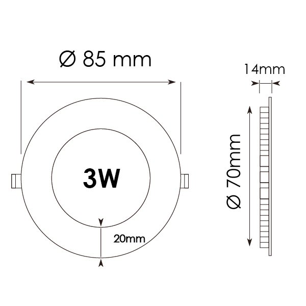 Downlight de LEDs redondo extraplano empotrable de 3W con acabado en color negro, es uno de los productos más utilizados en iluminación ya que es ideal para su instalación en techos, tanto si cuentan con poco o mucho espacio. Debido a su ángulo de dispersión lumínica de 120° lo hace ideal como fuente de iluminación para uso residencial (pasillos, zonas de entrada, salones, dormitorios, baños o cocinas) y espacios más amplios como oficinas, tiendas, hoteles, bares, restaurantes o supermercados. También disponible en versión regulable, adquiriendo el driver regulable. Están diseñados con un grosor ultraplano para poder instalarlos en techos de poca altura. La tecnología LED presenta un menor consumo en comparación con los downlight halógenos convencionales, permitiendo ahorrar cada mes en la factura de la luz. Para evitar daños en el driver o en la luminaria, se debe realizar la instalación sin tensión en la red eléctrica. Nunca conecte un panel a un driver cuando dicho driver tenga tensión eléctrica. Cuenta con una alta eficacia al consumir 3W mediante el LED SMD2835 15 leds que integra, logrando proporcionar un flujo luminoso de 270 lumens. La iluminación que aporta representa un consumo por valor de 3kWh/1000h, lo que supone una reducción de la cantidad de energía facturada y de emisiones de gases contaminantes a la atmósfera. Este downlight está disponible en tres temperaturas de color: blanca (6500°K), neutra (4000°K) y cálida (3000°K). Su instalación debe realizarse en lugares interiores al poseer un grado de protección IP20 (protección contra partículas sólidas de tamaño superior a 12mm y no es resistente al agua). Soporta un voltaje de entrada de 220/240V y una frecuencia de servicio de 50/60 Hz. A la hora de realizar el montaje de cualquier downlight es primordial tener en cuenta tres dimensiones. En primer lugar, el espesor del downlight (14 mm), por otro lado el diámetro de corte (70 mm) que debe ser igual o menor al agujero del techo, y por último el diámetro externo del downlight (85 mm) que tiene que ser mayor al diámetro del agujero. Además de ser un producto que tiene más de 30.000 horas de vida, dispone de una garantía de 3 años. Cuenta también con el certificado CE, que acredita que se cumple con los requisitos de la UE respecto a compatibilidad electromagnética y normativa de baja tensión. Con este certificado se declara la conformidad de dicho producto con todos los requisitos legales exigidos, y asegura la validez del producto para ser vendido en todo el Espacio Económico Europeo. Incluye driver