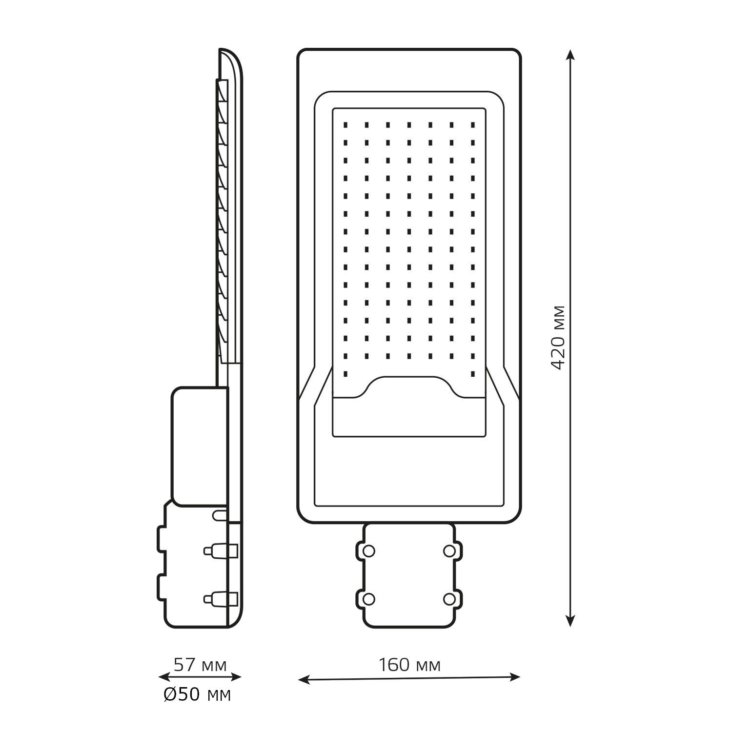 Dimensiones: 420 x 160 x 57 mm, diseño compacto y robusto.