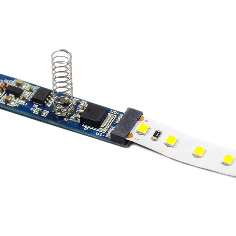 Interruptor + regulador (dimmer) táctil que permite encender y apagar las tiras de led de 12 y 24 V alojadas en perfiles de aluminio y también regular su intensidad de luz desde el 100% hasta el apagado. El dispositivo se aloja dentro del perfil y, gracias a un sensor óptico, permite detectar las pulsaciones que se hacen con el dedo sobre el difusor opaco. Su funcionamiento es muy sencillo, mediante una pulsación corta, el dispositivo enciende o apaga la tira (una pulsación para encender y otra para apagar). Si se mantiene una pulsación prolongada el dispositivo permite ajustar progresivamente la intensidad de la luz de la tira, desde el apagado hasta el 100% de luminosidad. Su conexión es muy fácil, mediante enchufe rápido sin necesidad de hacer soldaduras. Es importante recordar que en el momento de la conexión la tira siempre tiene que estar apagada. Soporta un voltaje de entrada y de salida de: 12-24V. Debido a su grado de protección IP20 es ideal para instalar en zonas interiores (protección contra partículas sólidas de tamaño superior a 12mm y no es resistente al agua). Además de contar con más de 30.000 horas de vida, dispone de una garantía de 3 años. Cuenta también con el certificado CE, que acredita que se cumple con los requisitos de la UE respecto a compatibilidad electromagnética y normativa de baja tensión. Con este certificado se declara la conformidad de dicho producto con todos los requisitos legales exigidos, y asegura la validez del producto para ser vendido en todo el Espacio Económico Europeo.