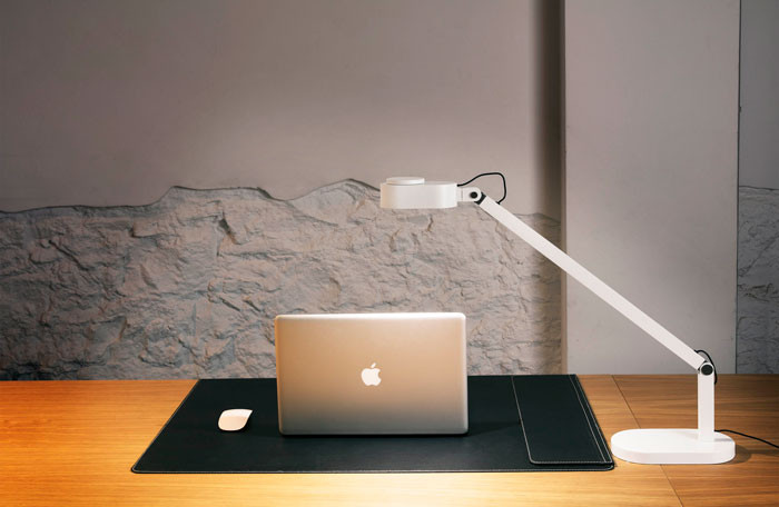 Lámpara de sobremesa INVITING de Faro Barcelona. Ganador del IF Design Award 2019 y el German Design Award 2019. Versátil y acogedora, con luz dimable en intensidad y en tono, manipulando la circunferencia superior. Cabezal regulable.