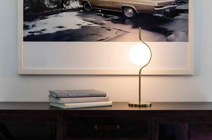 Lámpara de mesa Le Vita de Faro Barcelona. Delicado diseño de Nathrang que combina las líneas y las esferas en tonos blancos y dorados. Luz cálida con difusor para una iluminación suave.