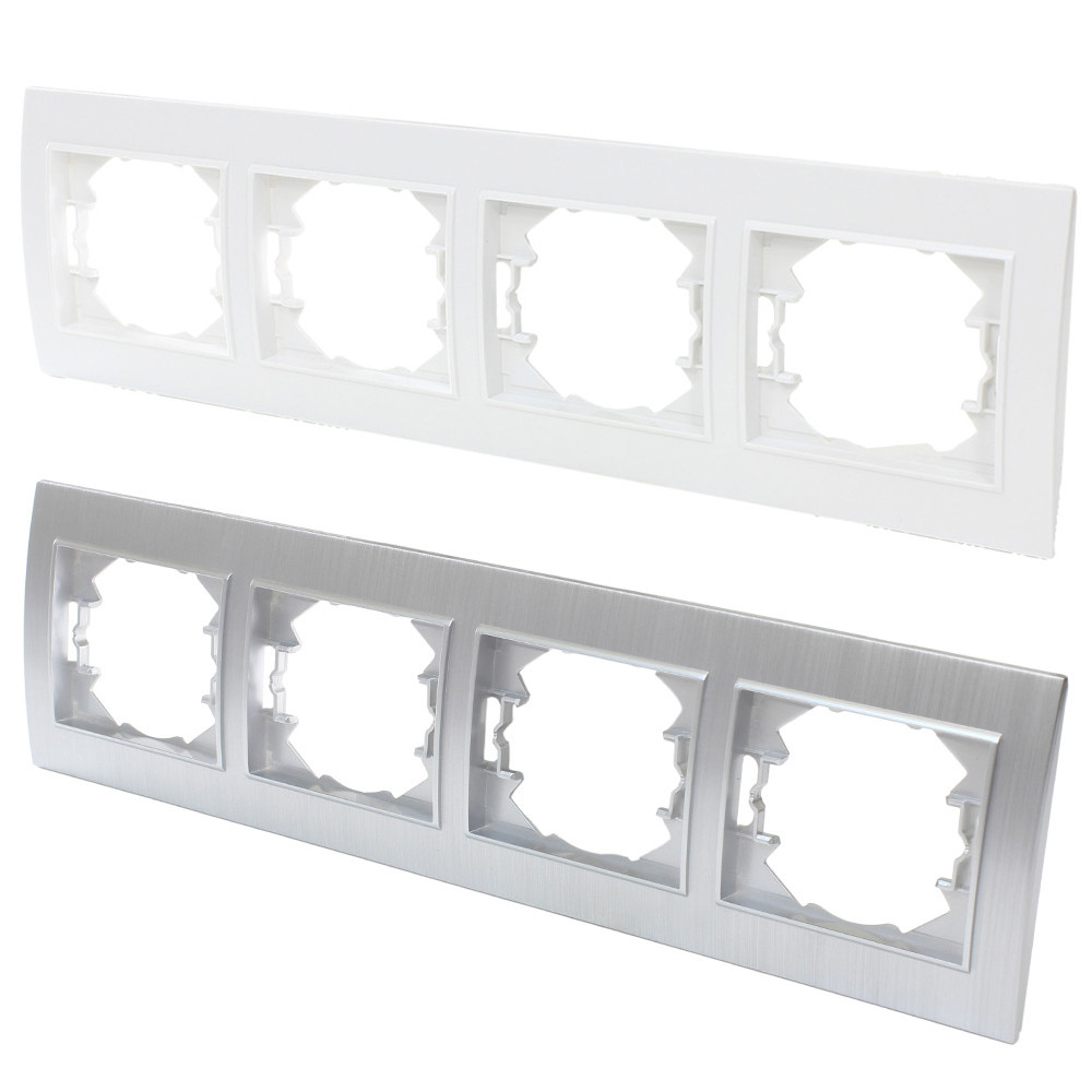 Marco embellecedor para cuatro mecanismos, disponible en tres colores diferentes: blanco, negro o plata. Es ideal para obtener una decoración moderna y minimalista en cualquier estancia dentro del hogar (pasillos, habitaciones, baños, salón o cocina), así como en hoteles, restaurantes, tiendas o centros comerciales. Compatible con todos los mecanimos de la serie PC, es apto para instalación sobre cajas de mecanismos empotrables universales. Está diseñado en policarbonato con las medidas 298 x 82 x 10 mm. Soporta un voltaje de entrada de 200-240V y una frecuencia de servicio de 50/60 Hz. Debido a su grado de protección IP20 es ideal para instalar en zonas interiores (protección contra partículas sólidas de tamaño superior a 12mm y no es resistente al agua). Dispone de una garantía de 3 años. Cuenta también con el certificado CE, que acredita que se cumple con los requisitos de la UE respecto a compatibilidad electromagnética y normativa de baja tensión. Con este certificado se declara la conformidad de dicho producto con todos los requisitos legales exigidos, y asegura la validez del producto para ser vendido en todo el Espacio Económico Europeo.