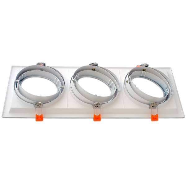 Este marco cuadrado triple de empotrar es ideal para la instalación de lámparas AR111. Su aro orientable permite dirigir el haz de luz de manera precisa en la dirección deseada para crear el ambiente perfecto dentro de cualquier estancia. Su diseño está pensado para ofrecer un ángulo de apertura pequeño y concentrar el haz de luz de la bombilla. Está fabricado en aluminio de color blanco mate con las medidas de 481 x 182 mm. La medida de corte es 445 X 150 mm. Su instalación es muy sencilla, ya que únicamente debemos tener en cuenta la medida de corte (300 X 150 mm) en el techo para empotrar la base redonda. Respecto a la luz que emite este elemento dependerá siempre de la bombilla que escojamos, pudiendo ser una luz fría, neutra o cálida. Su instalación debe realizarse en lugares interiores al poseer un grado de protección IP20 (protección contra partículas sólidas de tamaño superior a 12 mm y no es resistente al agua). Es ideal para su uso dentro del hogar, restaurantes, tiendas, comercios, hoteles o centros comerciales. Dispone de una garantía de 3 años. Cuenta también con el certificado CE, que acredita que se cumple con los requisitos de la UE respecto a compatibilidad electromagnética y normativa de baja tensión. Con este certificado se declara la conformidad de dicho producto con todos los requisitos legales exigidos, y asegura la validez del producto para ser vendido en todo el Espacio Económico Europeo. No incluye bombilla