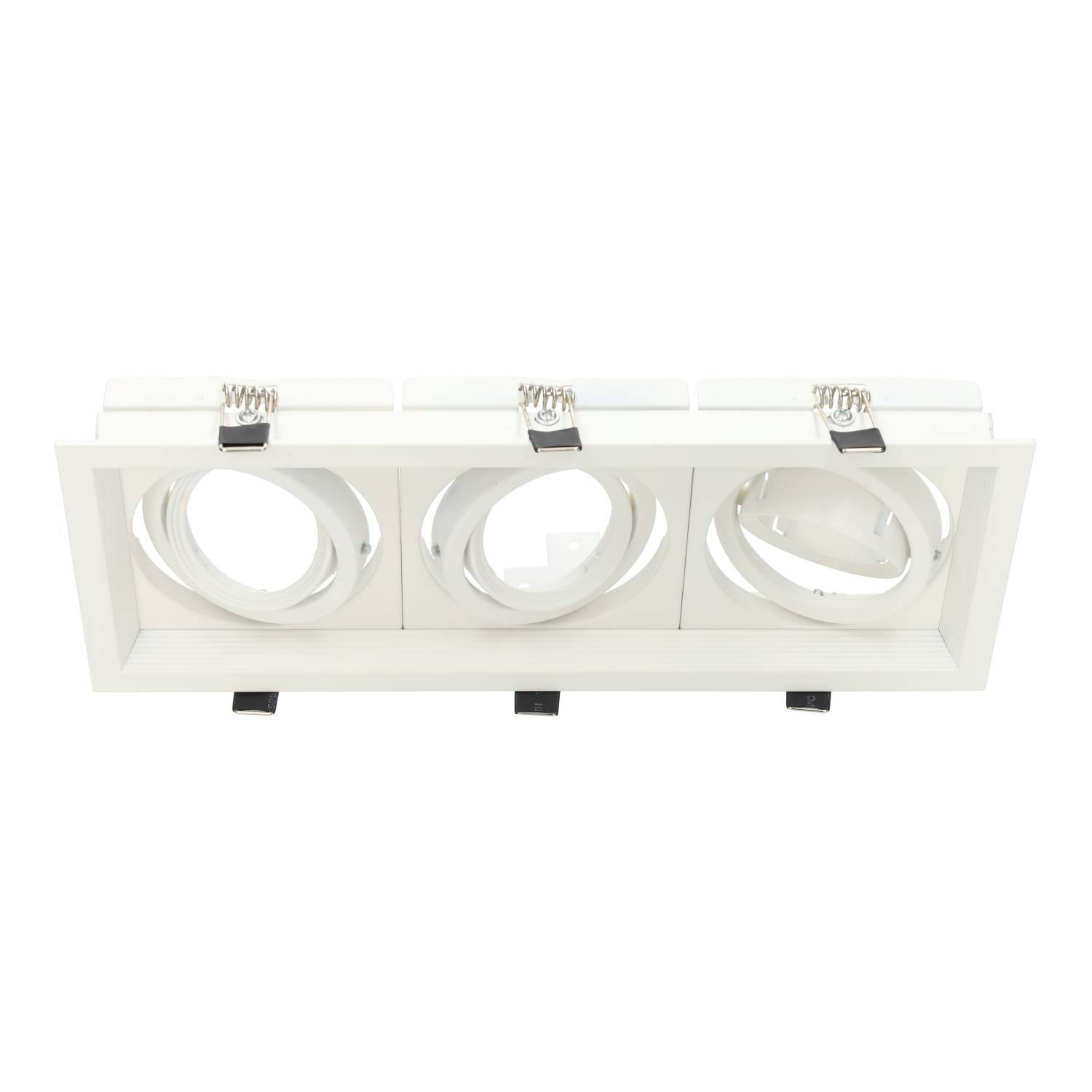 Este marco cuadrado triple de empotrar es ideal para la instalación de lámparas AR60 (55 mm de diámetro). Su aro orientable permite dirigir el haz de luz de manera precisa e independiente en la dirección deseada para crear el ambiente perfecto dentro de cualquier estancia. Su diseño está pensado para ofrecer un ángulo de apertura pequeño y concentrar el haz de luz de la bombilla. Está fabricado en aluminio de color blanco mate con las medidas de 310 x 120 mm. La medida de corte es 290 X 105 mm. Su instalación es muy sencilla, ya que únicamente debemos tener en cuenta la medida de corte (290 X 105 mm) en el techo para empotrar la base redonda. Respecto a la luz que emite este elemento dependerá siempre de la bombilla que escojamos, pudiendo ser una luz fría, neutra o cálida. Su instalación debe realizarse en lugares interiores al poseer un grado de protección IP20 (protección contra partículas sólidas de tamaño superior a 12 mm y no es resistente al agua). Es ideal para su uso dentro del hogar, restaurantes, tiendas, comercios, hoteles o centros comerciales. Dispone de una garantía de 3 años. Cuenta también con el certificado CE, que acredita que se cumple con los requisitos de la UE respecto a compatibilidad electromagnética y normativa de baja tensión. Con este certificado se declara la conformidad de dicho producto con todos los requisitos legales exigidos, y asegura la validez del producto para ser vendido en todo el Espacio Económico Europeo. No incluye lámpara