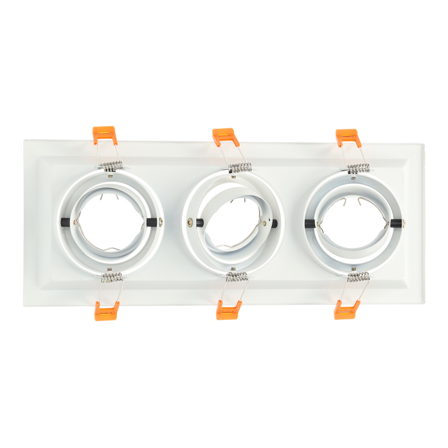 El marco cuadrado triple empotrable es ideal para la instalación de lámparas dicroicas, tanto GU10 como GU5.3. Sus tres aros orientables permiten dirigir de manera independiente el haz de luz de manera precisa en la dirección deseada para crear el ambiente perfecto dentro de cualquier estancia. Su diseño está pensado para ofrecer un ángulo de apertura pequeño y concentrar el haz de luz de la bombilla. Está fabricado en aluminio color blanco mate con las medidas de 320 x 130 mm. La medida de corte es 290 x 105 mm. Su instalación es muy sencilla, ya que únicamente debemos tener en cuenta la medida de corte (290 x 105 mm) en el techo para empotrar la base cuadrada. Respecto a la luz que emite este elemento dependerá siempre de la bombilla que escojamos, pudiendo ser una luz fría, neutra o cálida. Su instalación debe realizarse en lugares interiores al poseer un grado de protección IP20 (protección contra partículas sólidas de tamaño superior a 12 mm y no es resistente al agua). Es ideal para su uso dentro del hogar, restaurantes, tiendas, comercios, hoteles o centros comerciales. Dispone de una garantía de 3 años. Cuenta también con el certificado CE, que acredita que se cumple con los requisitos de la UE respecto a compatibilidad electromagnética y normativa de baja tensión. Con este certificado se declara la conformidad de dicho producto con todos los requisitos legales exigidos, y asegura la validez del producto para ser vendido en todo el Espacio Económico Europeo. No incluye lámpara.