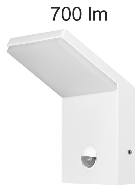 Aplique NEO 9W de Beneito Faure. Equipado con un sensor de presencia que cambia el ángulo luminoso. Muy resistente al entorno y a los golpes.