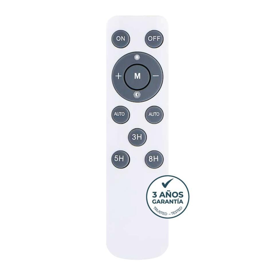 Medidas luminaria (mm) 194,4 x 167,4 x 35 (brazo soporte incluido). Medidas panel (mm) 270 x 180. Tiempo de carga 5-8 horas. Tiempo de uso Hasta 15 horas. Mando a distancia incluido para control de encendido, apagado, luminosidad y temporizador. Conexión
