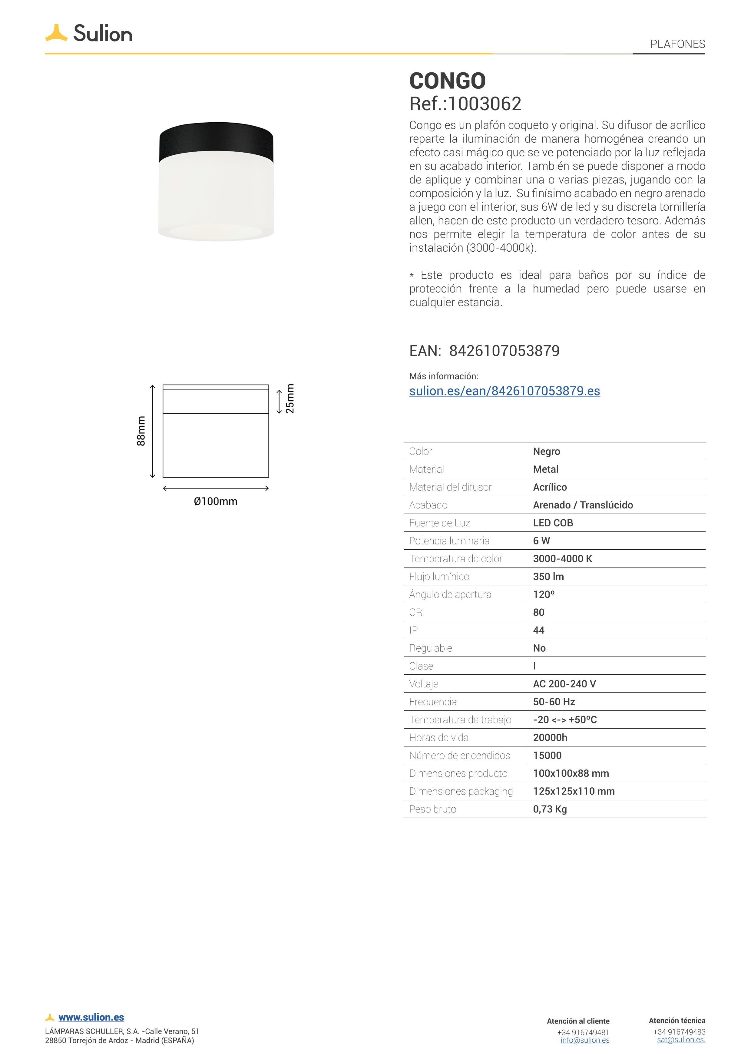 Congo es un plafón coqueto y original. Su difusor de acrílico reparte la iluminación de manera homogénea creando un efecto casi mágico que se ve potenciado por la luz reflejada en su acabado interior. También se puede disponer a modo de aplique y combinar una o varias piezas, jugando con la composición y la luz. Su finísimo acabado a juego con el interior, sus 6W de led y su discreta tornillería allen hacen de este producto un verdadero tesoro. Además nos permite elegir la temperatura de color antes de su instalación (3000-4000k). *Este producto es ideal para baños por su índice de protección frente a la humedad pero puede usarse en cualquier estancia.
