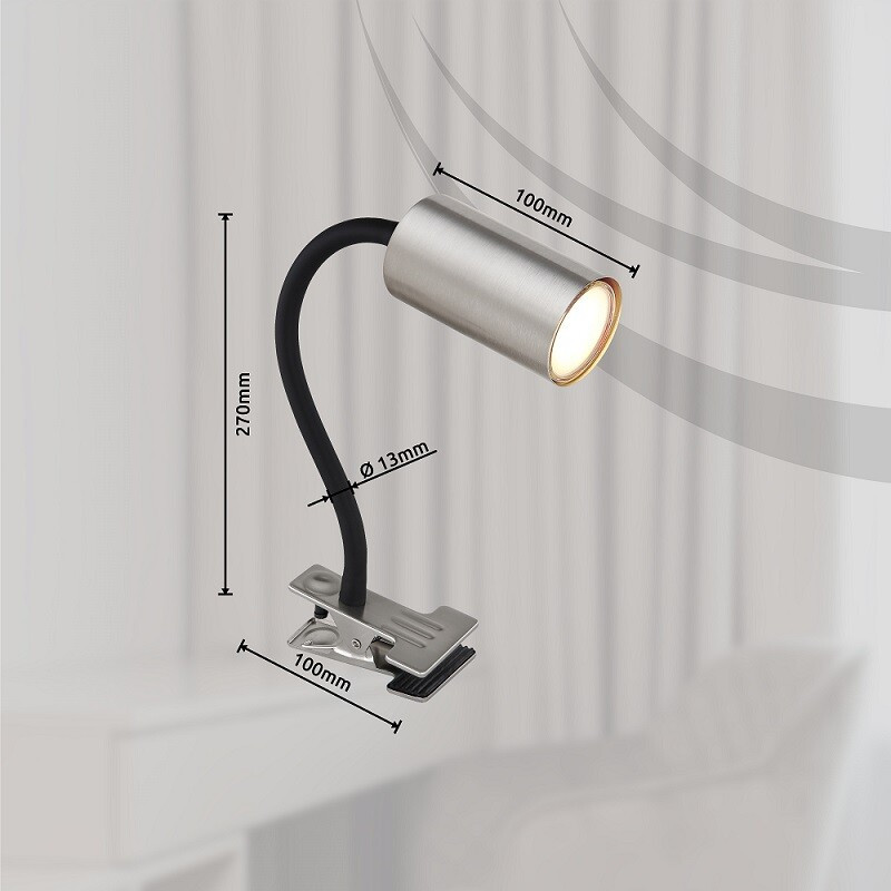 Flexo con pinza para sujetar en mesas o escritorios. Cuenta con interruptor de encendido/apagado. Para bombilla GU10 no incluída.