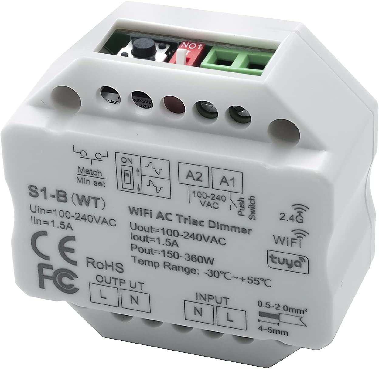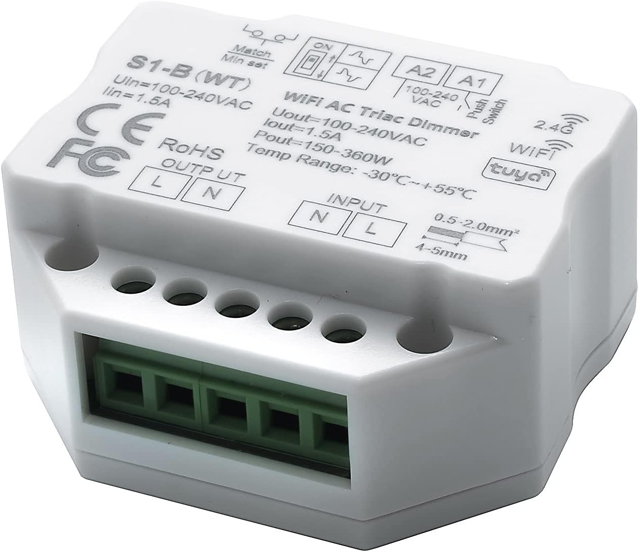 Regulador de pastilla para una potencia máxima de 360W, para diferentes tipos de iluminación LED (bombillas, lámparas dicroicas, paneles, tiras, downlight, etc). También es compatible con luminarias regulables convencionales. Se puede controlar mediante pulsadores, con el mando Control remoto RF para Dimmer LED o mediante WiFi a través de la aplicación Tuya. Tipo TRIAC. No regula corriente continua. Entrada con terminales de tornillo, ajuste hasta el brillo mínimo, tamaño pequeño para poder instalarlo en una caja de pared estándar. Está diseñado en PVC con las dimensiones 50 x 50 mm. Es capaz de soportar un voltaje de entrada de 100-240V. Debido a su grado de protección IP20 es ideal para instalar en zonas interiores (protección contra partículas sólidas de tamaño superior a 12mm y no es resistente al agua). Dispone de una garantía de 3 años. Cuenta también con el certificado CE, que acredita que se cumple con los requisitos de la UE respecto a compatibilidad electromagnética y normativa de baja tensión. Con este certificado se declara la conformidad de dicho producto con todos los requisitos legales exigidos, y asegura la validez del producto para ser vendido en todo el Espacio Económico Europeo. Incluye manual de instrucciones.